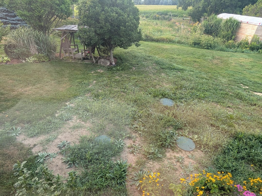 We installed new septic which left us no choice but to seed and water during late June (In hindsight I should have got sod maybe). Unfortunately I had to leave the country for a month in July. By the time I left, some grass had started growing already. I came back to a lot of different kind of weeds and little grass in between