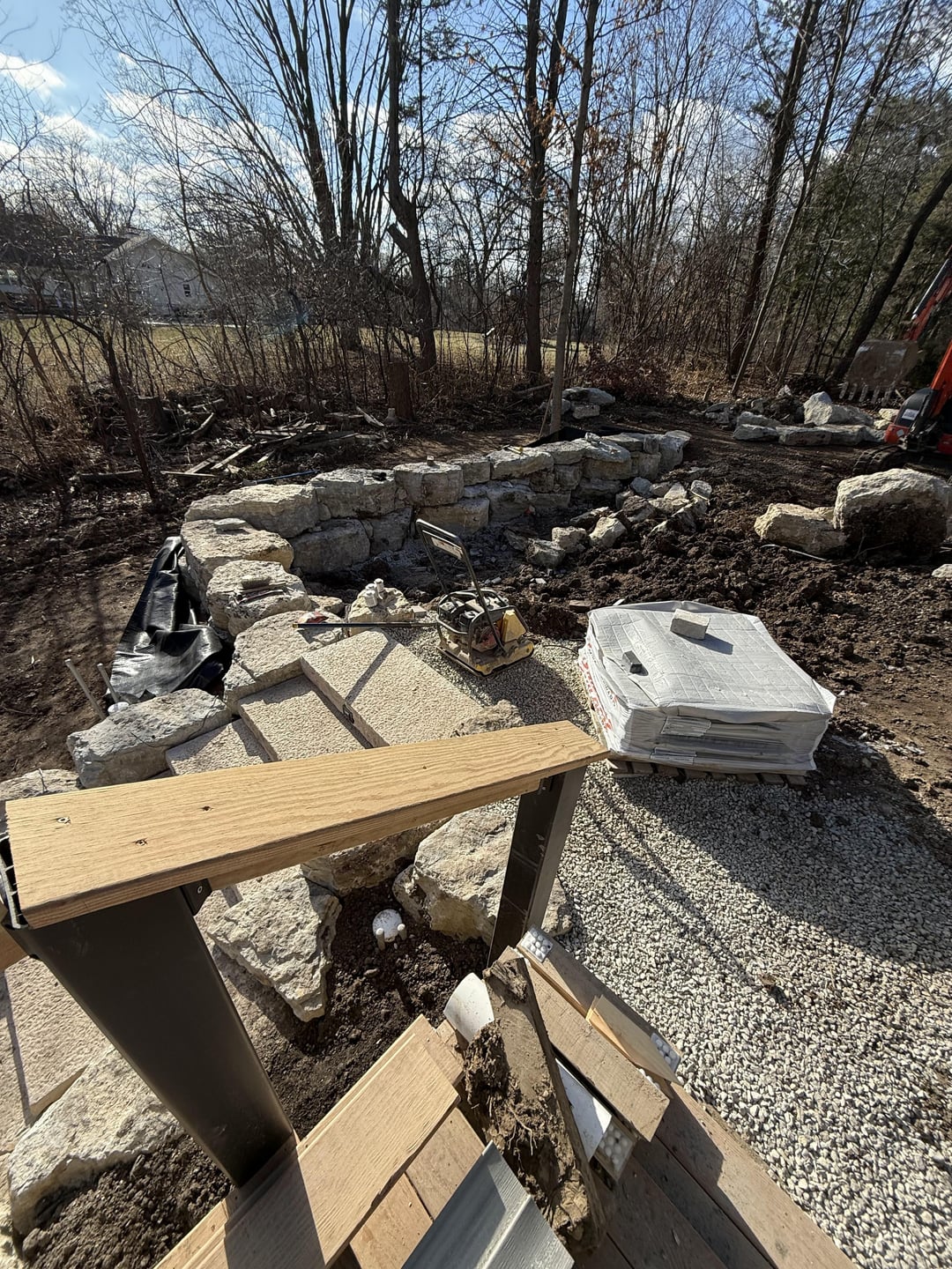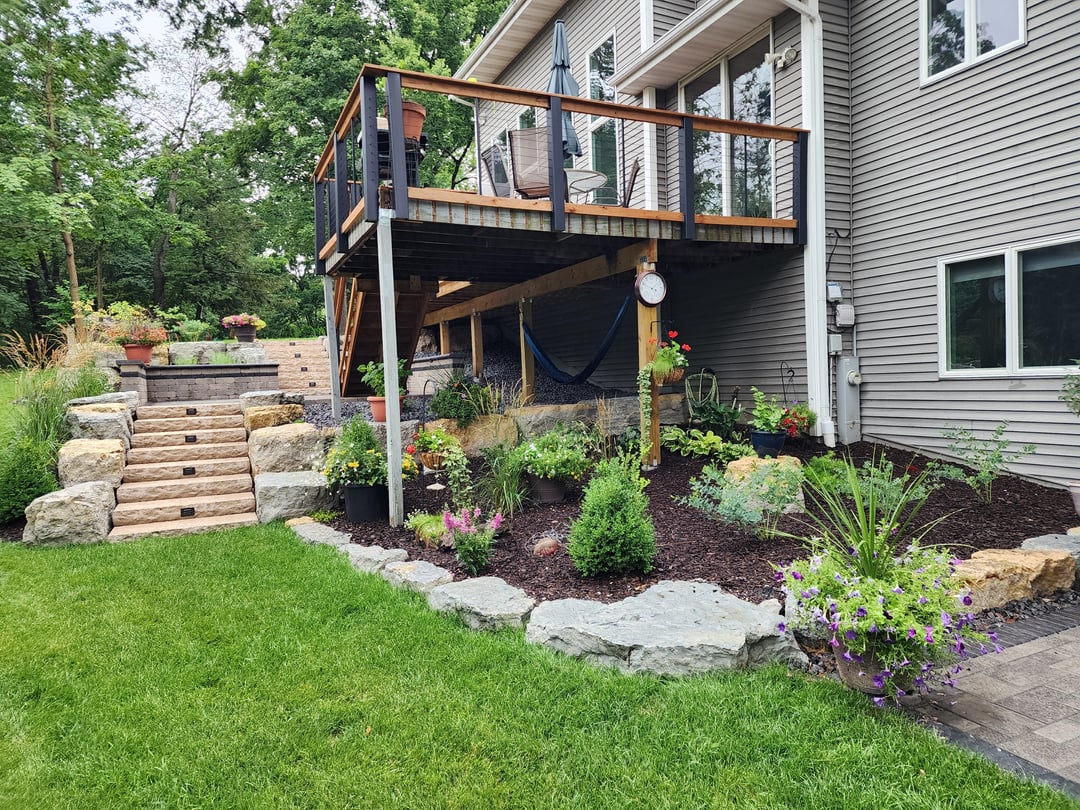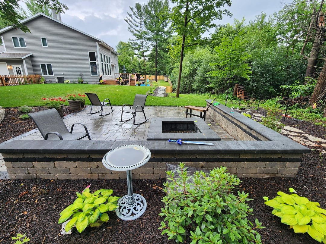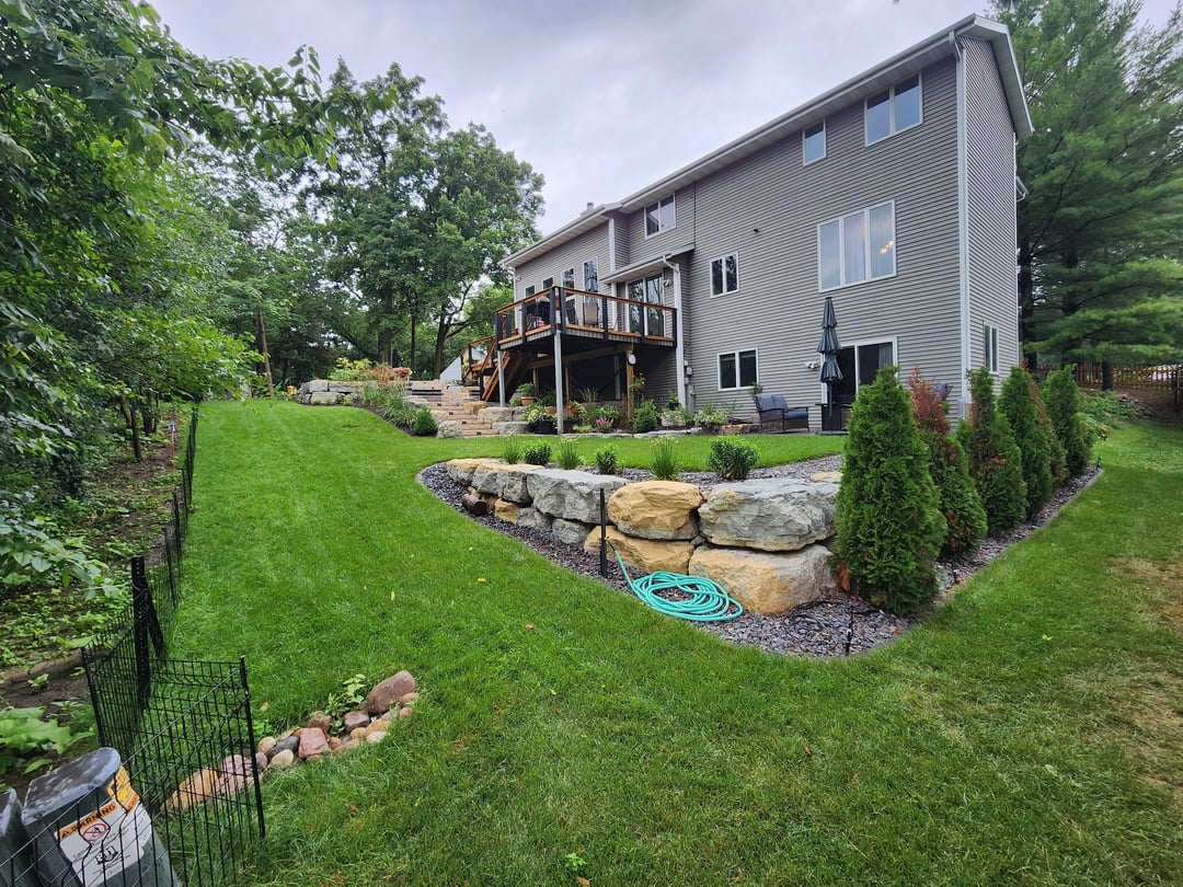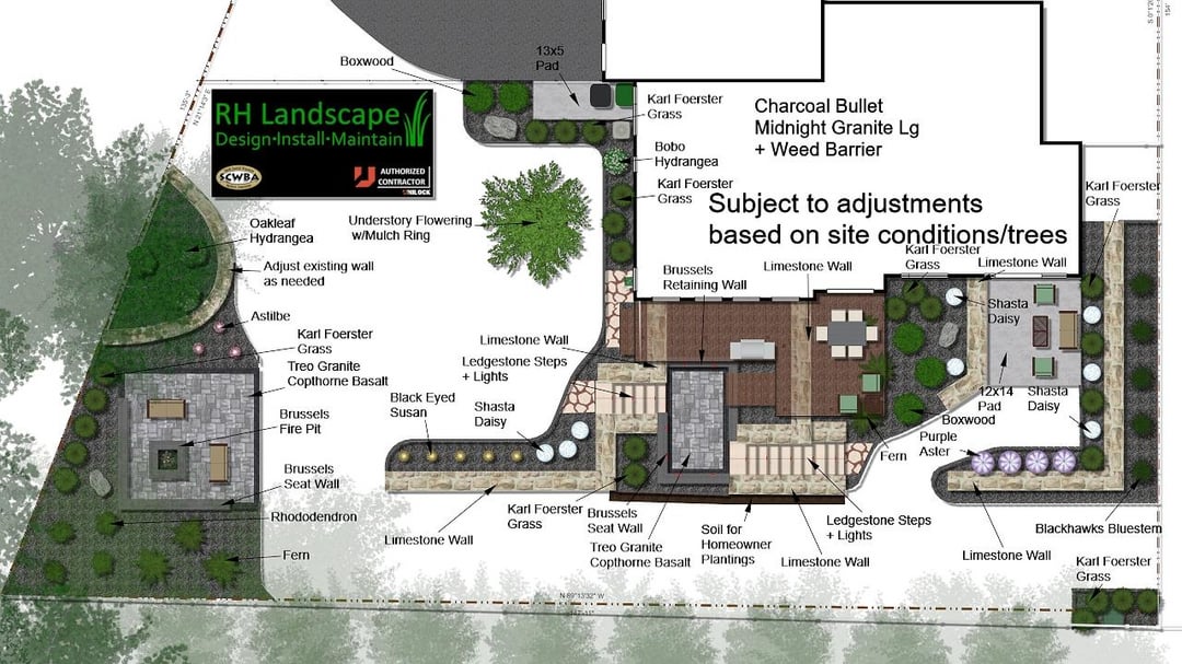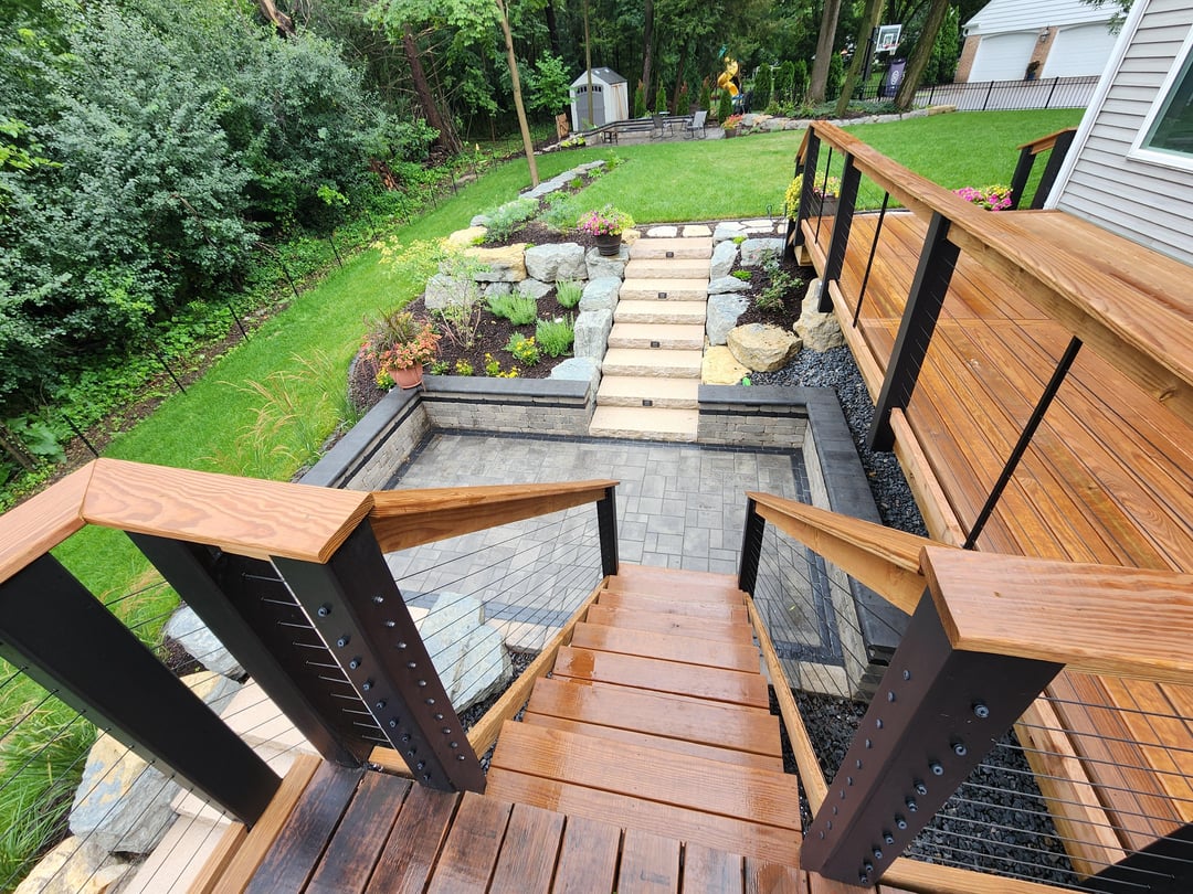 Started with a plan and then many iterations during construction even. The landscaping contractor did large boulder retaining walls, steps with lights, patio landing with lit seating wall, lower paver patio, upper fire pit patio with lit seating wall, patio base for shed, brick edging, rock, mulch, downspouts, and close to 100 plants/shrubs. Other major thing was a much bigger grass area, which required a lot of fill. Besides these guysvworking every day, had different contractors for tree removal , stump grinding, deck extension, wood fence, irrigation, electricians for lighting and outlets behind firepit and under deck. I had to do a bit of coordination but thankfully I work from home.