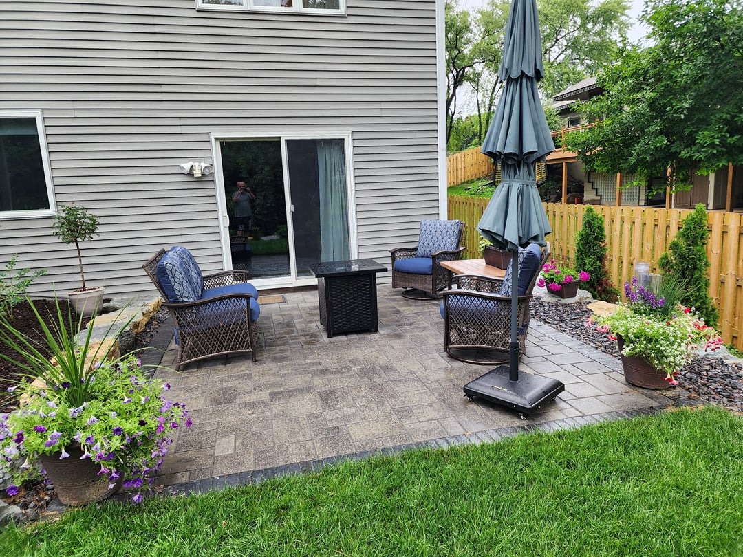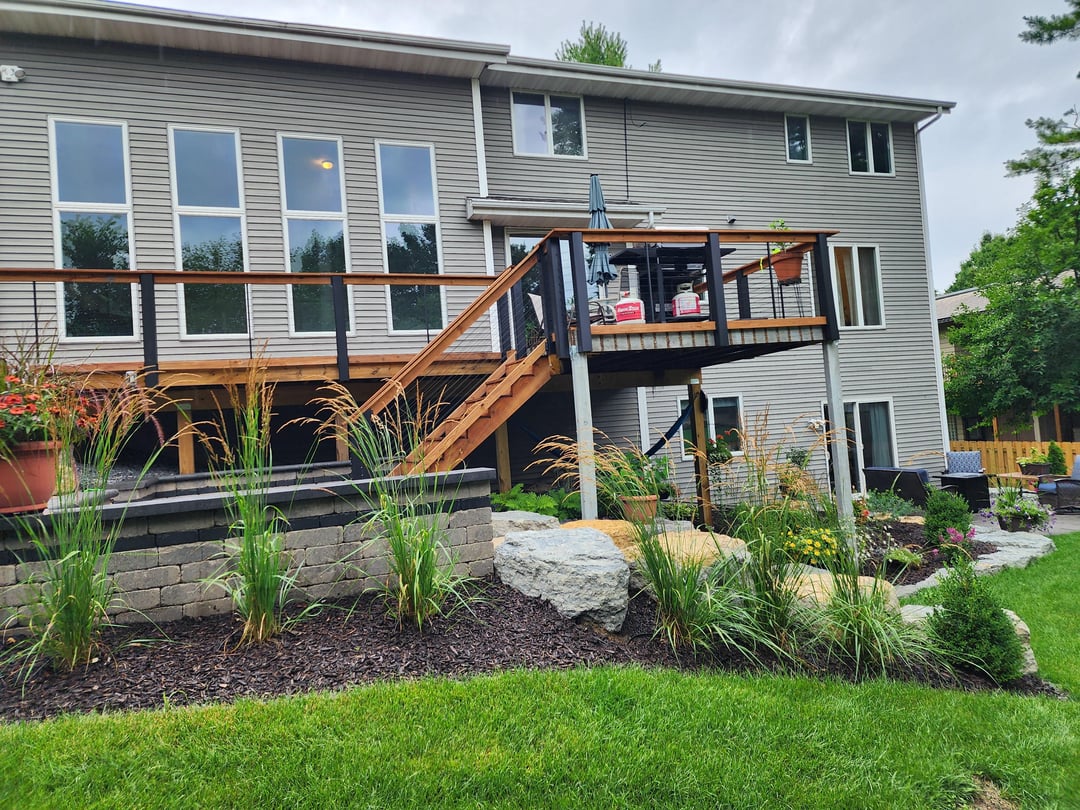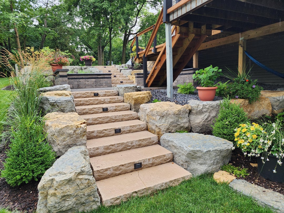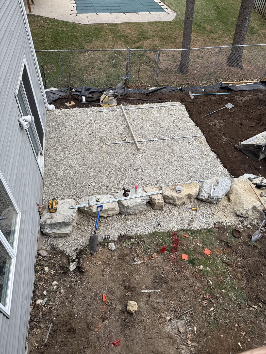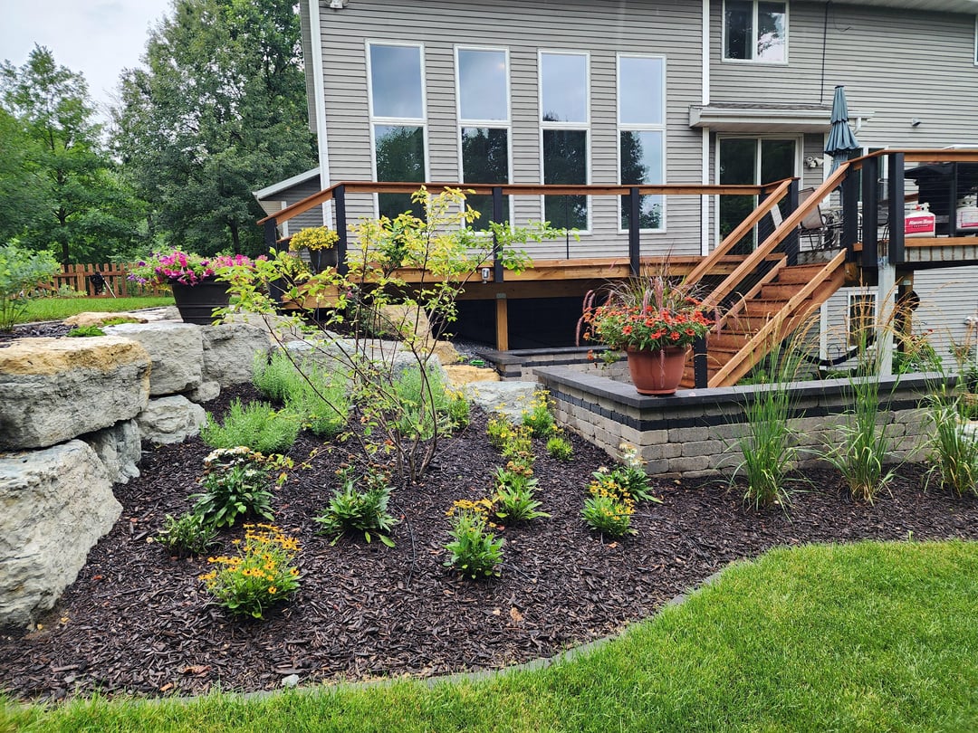 Started with a plan and then many iterations during construction even. The landscaping contractor did large boulder retaining walls, steps with lights, patio landing with lit seating wall, lower paver patio, upper fire pit patio with lit seating wall, patio base for shed, brick edging, rock, mulch, downspouts, and close to 100 plants/shrubs. Other major thing was a much bigger grass area, which required a lot of fill. Besides these guysvworking every day, had different contractors for tree removal , stump grinding, deck extension, wood fence, irrigation, electricians for lighting and outlets behind firepit and under deck. I had to do a bit of coordination but thankfully I work from home.