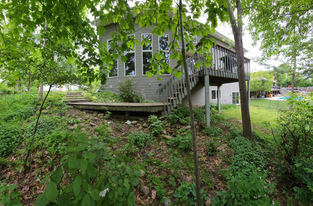 Very happy with how our backyard mega project came out! This is a long post with lots of chronological pictures but I put the best 2 of the after in the beginning. We bought our place a little over a year ago and knew the yard needed work. Overgrown trees dangerously close to the house. Weeds, burrs, pricker bushes taller than me. Very small patch of grass. Steep hill, odd shape lot. But a very nice house in a good neighborhood, so worth it in the end.