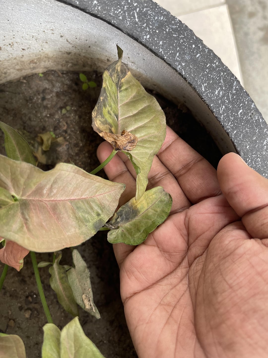 I agree that the pot is way too big for plant. If its a young plant, means the root might be small too. When you’re watering, the water might gather at the bottom of the pot so the root probably doesn’t get any water at all.