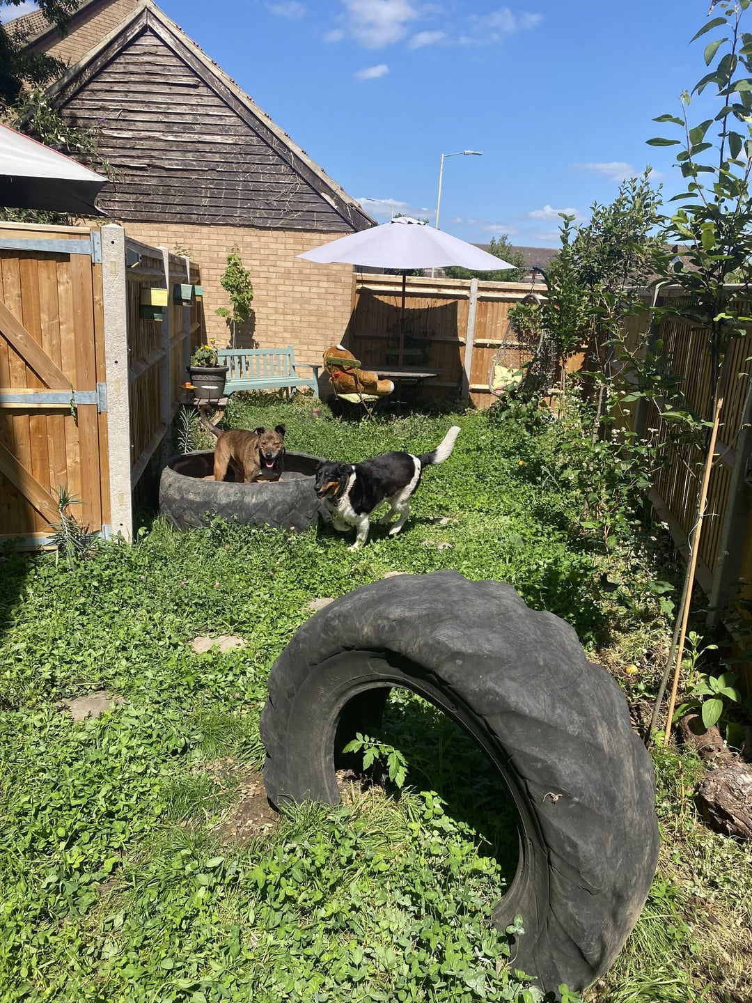 October 2024 – Today. Cut down overgrown invasive hedge, put up fence, dug out so much litter (20+ year old food packets, bottles, pocket knives) – soil smelt awful, mulched and mulched and now it grows healthy mushrooms and wildflowers 🙂 it’s mostly an enrichment area for the dogs hence the tractor tyres 😛