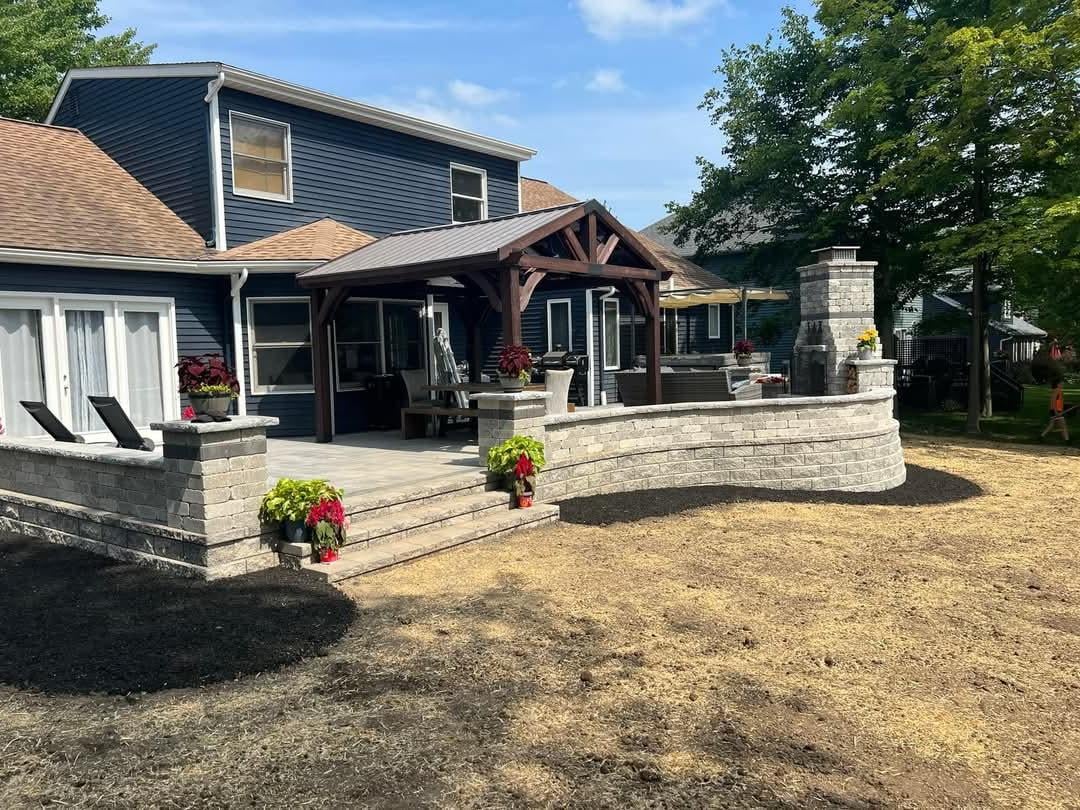 Pergola, paver patio, fireplace, seat wall, and grill station (no built in grill – just a place for mine)