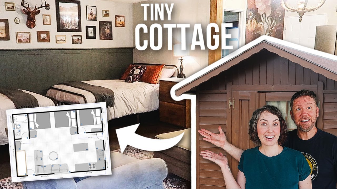 It all started with an idea. See, Kevin’s parents have this cabin in Strawberry, Arizona, and right down the hill is a little shed garage. We’ve always thought about helping them turn it into something fun, usable for the family. But it was finally this year that we were like, “Okay, let’s do it. Let’s do it.” And we decided to turn it into a little cottage because we have such a big family now. We need more sleeping space and maybe another bathroom. Here’s the tutorial on how to do a tiny house with both a frugal reuse person and then a person that also nonfugal. No, the person that does uh good style and decorating. If you do a combo of that, it’s the perfect way to do a project. Together, we came up with three plans. So, the first plan was okay. There were some like pros and cons to it. We didn’t like the bathroom on that one side. The second plan was nice, but then we thought like, why are we saving this stove? We’re not really up there in the cold. So, yeah, we kind of nixed that. But we finally settled on this plan. Plan C. This had the bathroom in a good spot to be able to do the plumbing really easily, and everything worked out really good. But we knew it was going to take us a long time because we would have to drive up like in trips over the course of a year. And so, yeah, it was it took a lot of planning. We knew we were going to start really in the summer, but Kevin went up there real quick in the winter and just couldn’t help himself. One of the times, I think you were taking Lenny to college or something. Oh, yeah. You were like, “Okay, I’m gonna put up the wall, the faux wall for the bathroom, so we could get an idea of what it’s going to look like.” It look like a room. It was a bathroom. So, then the summer rolled around and we were ready to go. And the first step was cleaning out the place. Oh, that’s what it looked like to start with. That’s crazy. Yeah. We had to take all this out. Said goodbye to the stove. Said goodbye to the pool table. That was an adventure to get that one out. That was so heavy. And then just a lot of other little storage things. Cleaned it up, washed the walls, and then we got started on the paint that we changed our minds on. We painted this entire room with this gold paint that was left over from the cabin. And I thought, “Oh, let’s just make it match.” Like, I don’t really care about color, but Denell does care about color. Yeah. Just it was just a practice one. Yeah. And then it was a primer. It was a primer and then we did the real color afterwards. Yeah. There you go. I want to talk to Facebook Marketplace and oh my gosh, you guys, I found this super rich couple in Scottsdale who were selling all the cabinets in their house and it they were beautiful. And so I thought, okay, we can do this. We can get these. They said we could have them all if we could get them out ourselves. And we were like, we’re strong. So, we went there and because this granite countertop was like 4 in thick, four inches thick, we couldn’t break it and we couldn’t get it off. They wanted us to break it, but it was so glued to the cabinet, like hard glued. There was just no way. And we were just stuck and we were so we were sad, frustrated cuz there was just no way we were going to be able to do this. So, we went home defeated. They were so nice. They called us back and they said, “Hey,” cuz of course they were out of town at their other house. Um they called us back and they said we’ll use our jackhammer and break it all up. Well, they said they would let their they would have their contractor do it for us and we’re like that’d be great. So they took them all apart for us and we were able to salvage as many as we could and we didn’t know how we were going to fit this in. But yeah, we only took about a fourth of the cabinets cuz the mansion was huge. But it was a lot. It was still a lot. So back up at the cabin after Kevin took down the garage door, the last part of the garage door, and he did it really good. that he didn’t kill himself or anything. So, no. Yeah. After I finished painting, we painted the finished the primer. Third coat. Yes. I forgot. We did like three coats. Oh, you guys. It was a lot. So, then we decided to get started on the floor, which we had plans. We had these grand plans. We were going to stain the concrete. Yep. So, we washed it. Washed it. And we primed it and acid cleaned it. Yeah. did all this stuff and we started with the stain. Now, we were we did a lot of research and then we asked this company and they said, “No, no, no. You don’t want to do the acid stain. You want to do regular stain. Regular waterbased.” We’re like, “All right.” And so, we went ahead and got to work and it looked really nice at first. We were super excited about it. And when we got all done with the two colors we layered, we were like, “This is like perfect. I can’t Why doesn’t everybody do this?” And then they told us we needed to add like a gloss finish to it. Mhm. But the finish wasn’t gloss. It was more of a dusty. Anyways, the floor was a mess. The floor had all these streaks on it. It never fully dried and or when it did dry, it looked so gross. So, we were pretty bummed about it, but they made us do a third gloss coat on it and then it made it passable. They were Well, yeah. So, we got to a point which was doable. We We were like, “Okay, we’ll work with this.” And so, we just moved on past that. cocked the bottom of the wall, which he didn’t want to do, but us girls wanted to do it just in case of spiders, you know? It’s good. And it was about this point, I remember this day, I was so depressed because I had this moment where I was like, I don’t think we can do this color. And I felt so bad that we had all put so much time into painting it, but it just was not looking good. And there was not a lot of light in the cottage. So, I was like, we needed to lighten it up. 