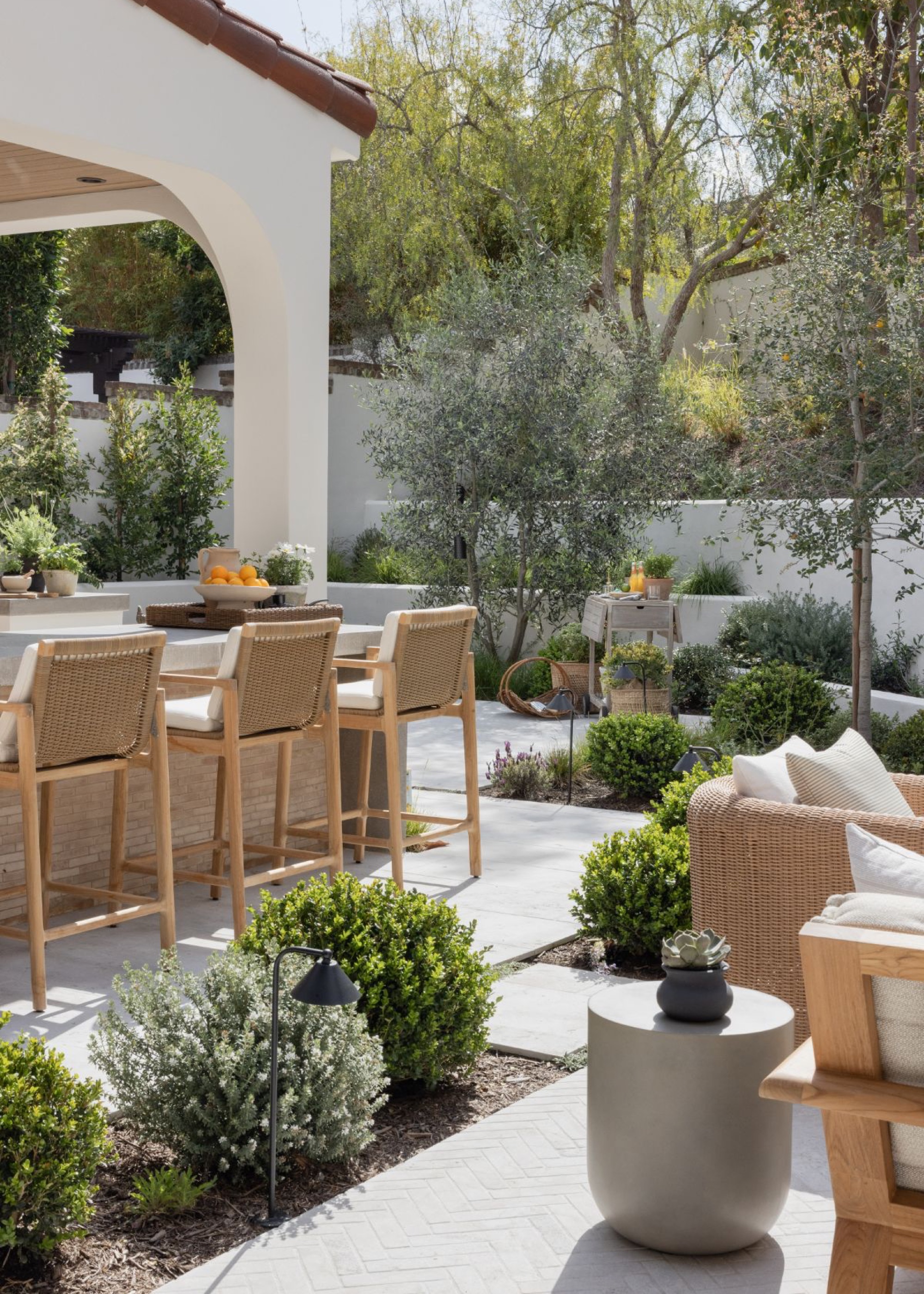 A series of ornamental shrubs defines the outdoor kitchen and outdoor living areas in the beautiful garden above.