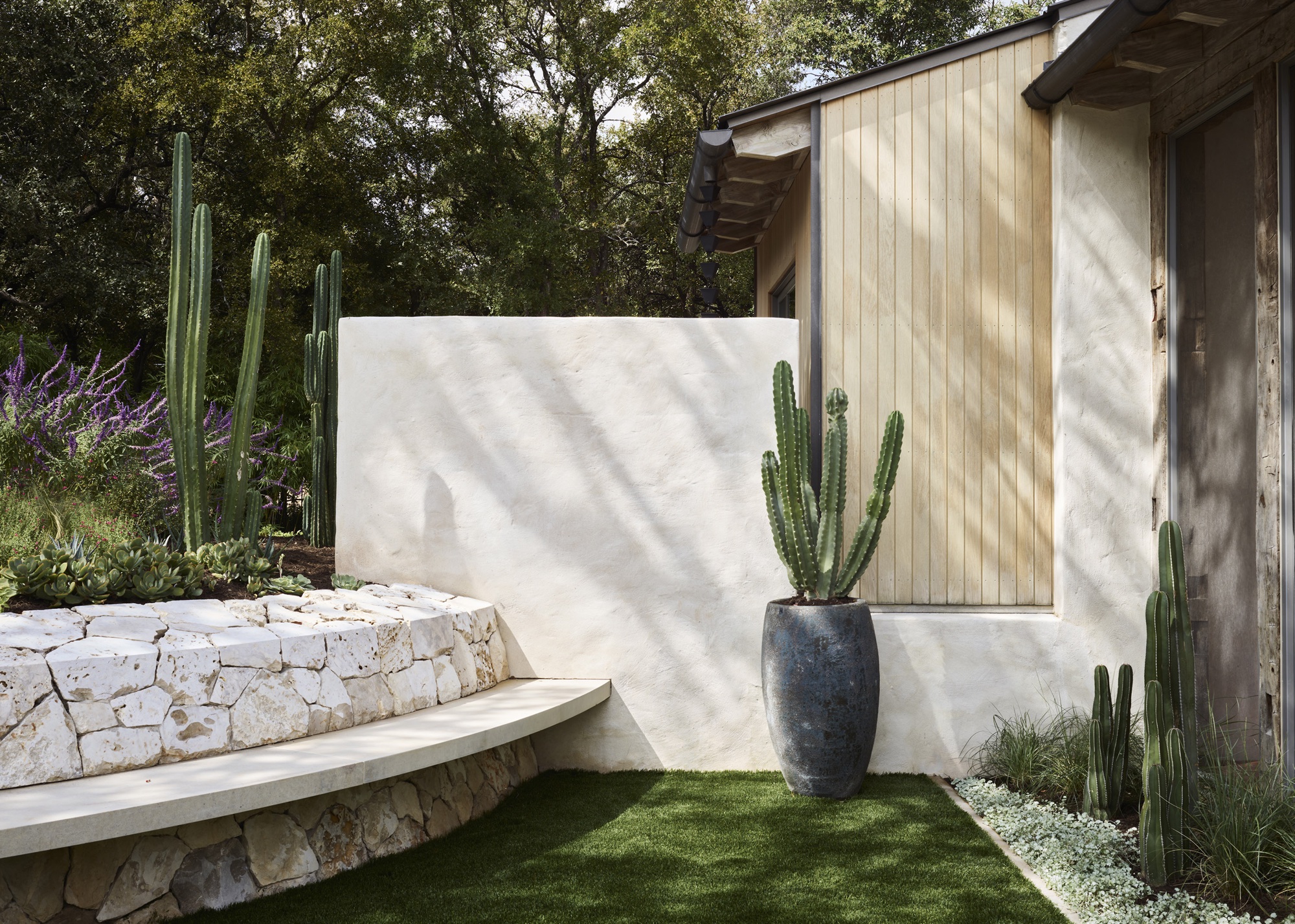 Speaking about the tranquil rest area above, Ryan Street says, “Outdoor rooms don’t always require high walls. Sometimes, the suggestion of enclosure is enough. Soft stucco planes and curved stone benches subtly carve space without interrupting the natural flow of the garden.