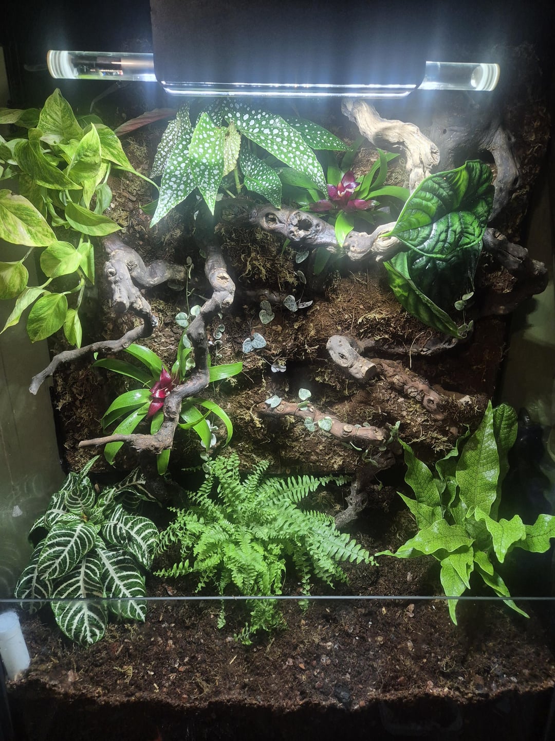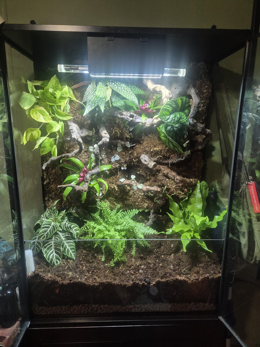 This is my first terrarium build ever and I'm really pleased with it. I used a rudsta cabinet for the vivarium so it's 81x100x30ish of space. I still need to add some finishing pieces, some nerve plants on the floor, some leaf litter and an actual light. My makeshift one won't do.