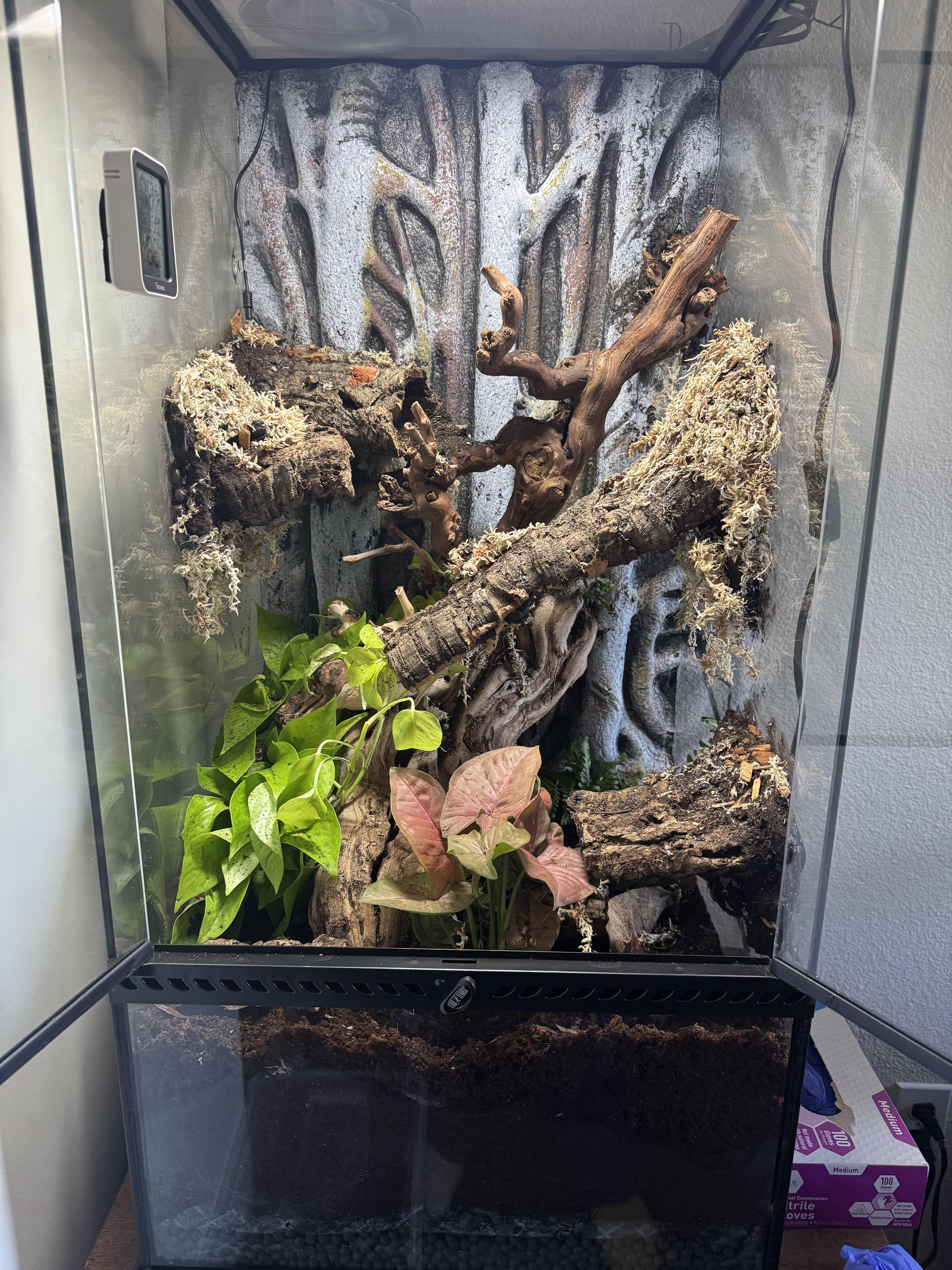 I’ve been working on this vivarium and currently have neon pothos, syngonium, and autumn fern (in the back right and a smaller portion behind the diagonal wood). I’m wondering if you guys have any plants you can recommend and ways I can increase plant foliage in the upper half. I’m preparing my vivarium for a crested gecko and they need more plant density.