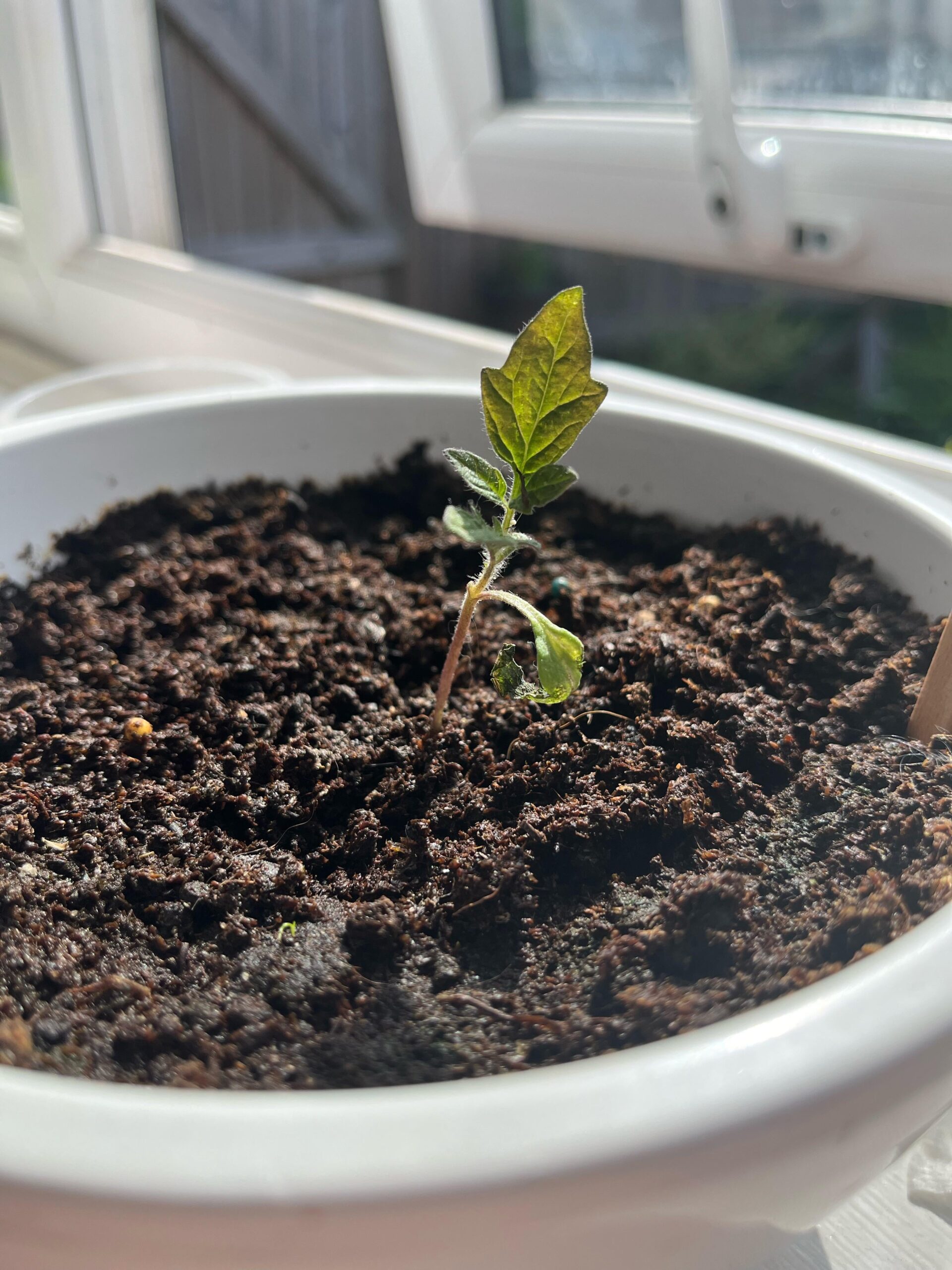 I found this baby tomato plant (I’m pretty sure anyway) growing in between bricks in my garden and decided to move it to the first pot I could find. Didn’t have a plastic one to spare.