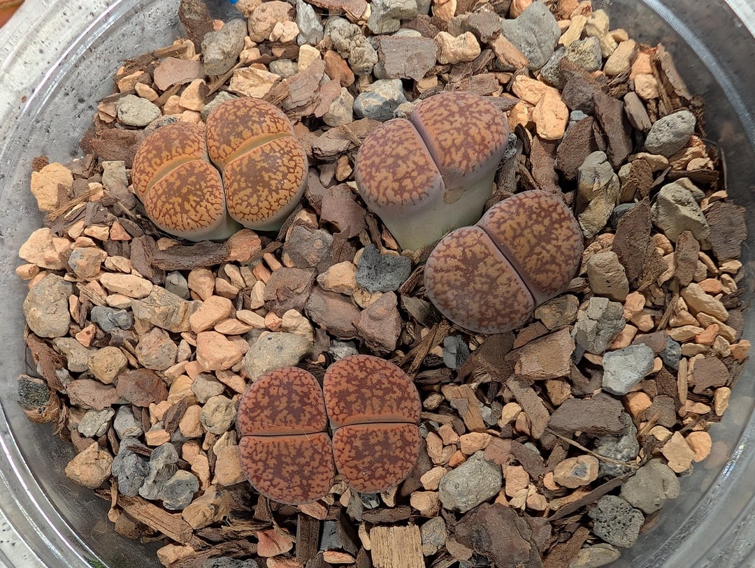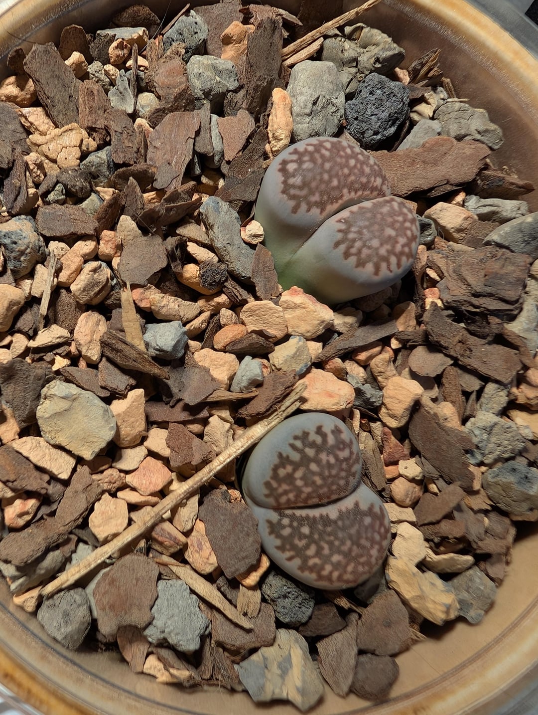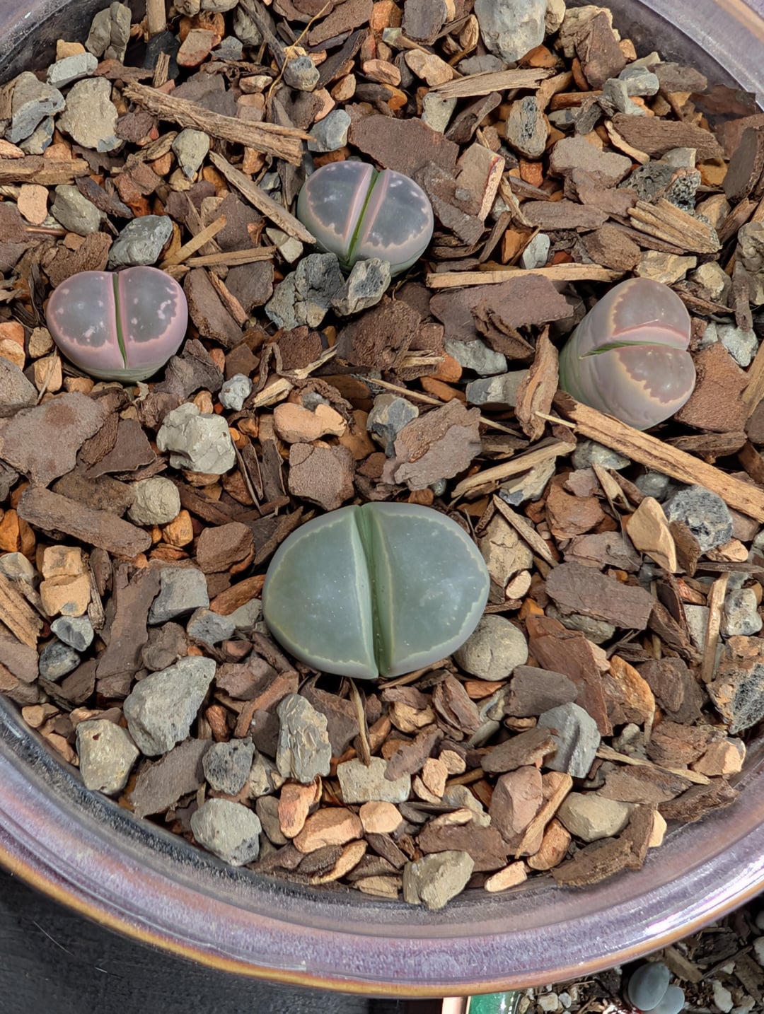 The first two photos are of a set of Lithops I got over a year ago. I don't think I watered them at all because they were bloated, etc. But then they started shriveling which you can see on the sides. I watered with a dropper a couple of times without change, so I did water therapy a few times over two weeks and new roots are now growing. However, they're still wrinkled and I'm not sure they're taking in water at this point given the unchanged wrinkles.