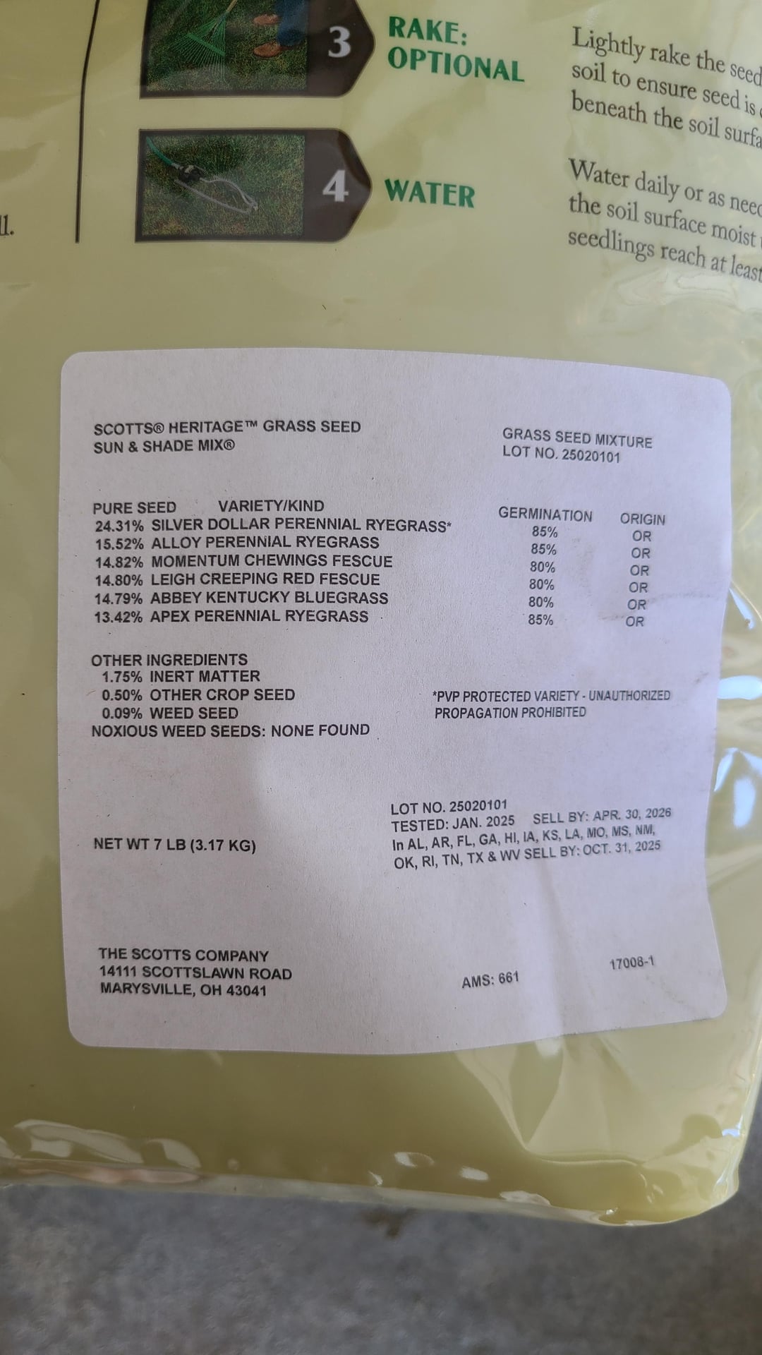 I can’t speak for Scott’s Heritage but it does look far better than their other products. The inert matter % is typically very high in Scott’s seed products, sometimes almost 50% of the seed mixes or more. I don’t know what these ryegrass or fescue varieties are, there’s so many turf grass cultivars it’s hard to keep up with what’s what. So as far as this bag goes you probably did ok, but don’t waste your money by throwing it down now just wait a few weeks and you can seed for the fall.