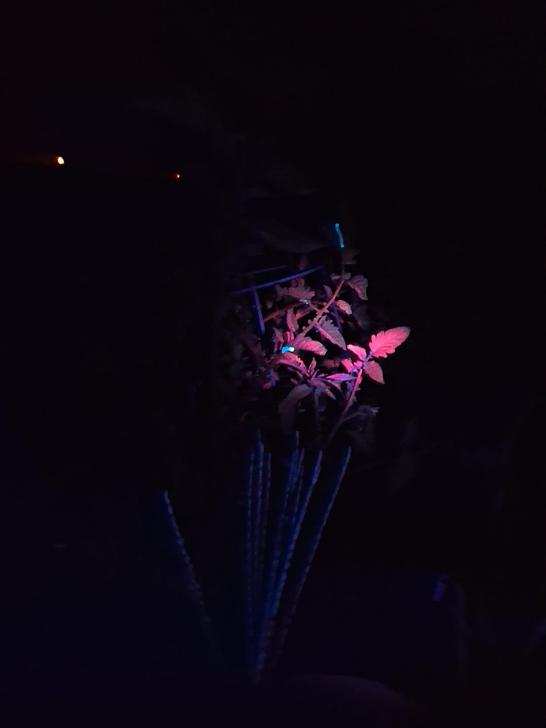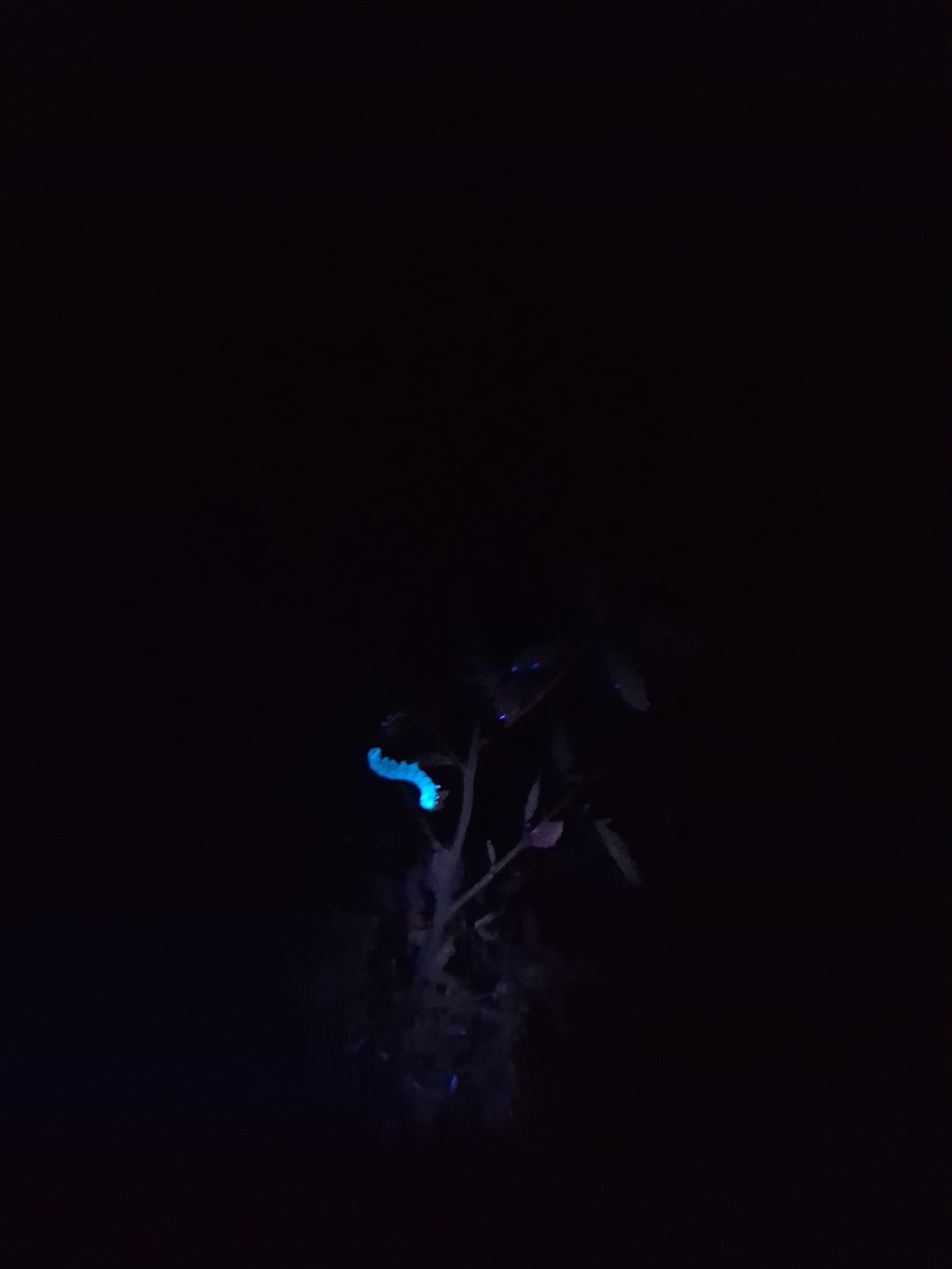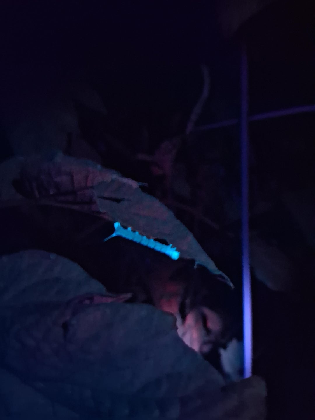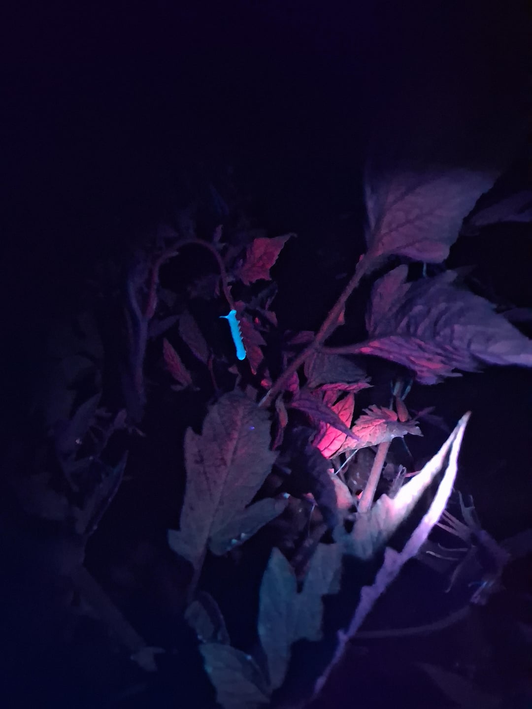 We have lots of tomato plants in the garden this year and the hornworms have started to eat them. Dad got a hot tip from a co-worker that they will glow at night under a black light and be easy to spot. I ordered one, it came today and does it ever work great to spot them. Even the tiny little ones only a few cm in size stand out very easily.