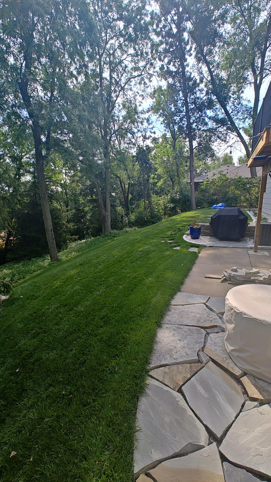 50 yards of fill, 12 yards of top soil and 2,000 sf of fescue sod. My partner and I handled the top soil and laid the sod ourselves. We also did all of the landscaping. Felt like death for about two months, working whenever we could. But we now have a usable backyard space. The sod was installed in April of this year.