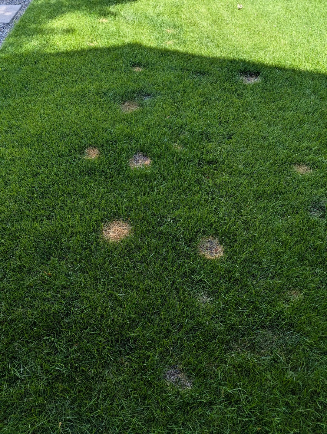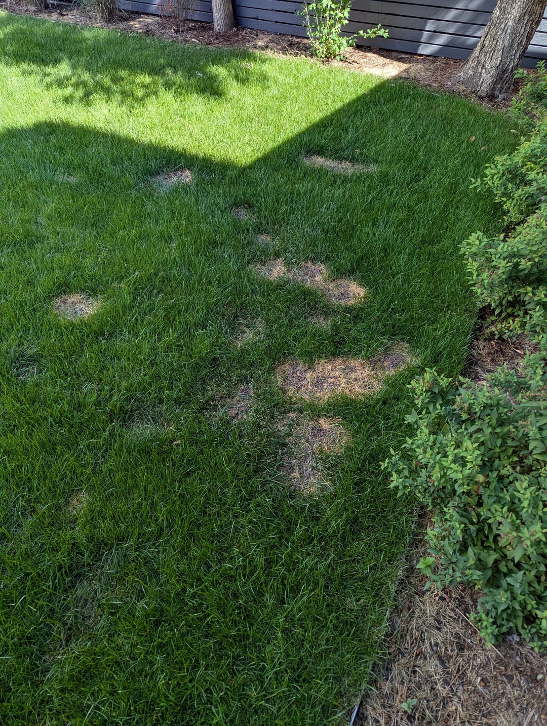 I tried putting down some anti-fungal spray and pellets but that didn't make a big difference. I've been in the cycle of putting down seeds (fescue, rye and I previously tried bluegrass but not recently) on the patches and then watering daily for a couple of weeks. But, now I have shifted to watering for longer (30 min) about 3x per week.