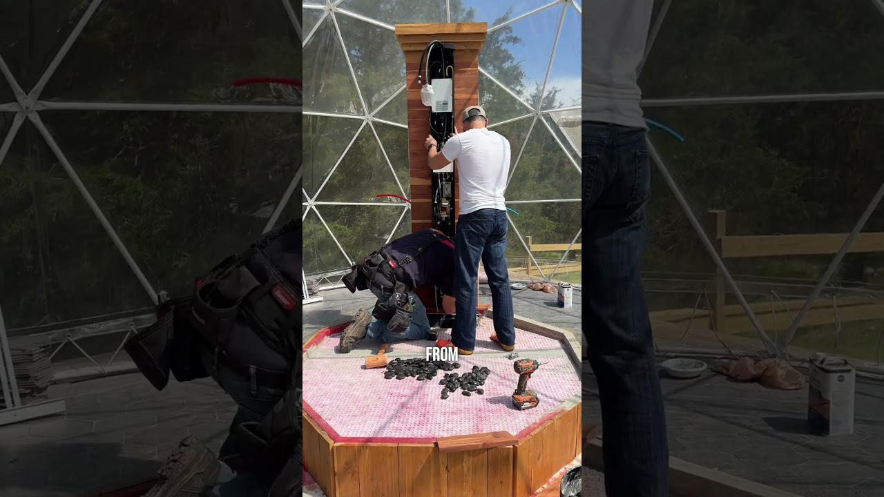 Behind me is a shower that we’ve built in the greenhouse. But let’s back up really quick. I could not find a greenhouse shower concept for the life of me. So, I’m going to show you how we made ours. We built and stained a level platform and then built a dome from dome spaces. I screwed down Hardy Backer and built an octagon-shaped platform in the center to complement the roundness of the dome. We waterproofed it and built a small backboard wall from the cedar wood we harvested from our land and laid down a black shower tile. Oh, and this is Penny. She’s an absolute menace, but clearly very cute. Once we got the wall up, we installed a water recycling shower unit from Rainstick so we can save as much water and energy as possible. Next, I happily directed my OCD tendencies into puzzle piecing the river rocks together in the most meticulous way while Penny ate our screws and nails. Working in a greenhouse in the middle of summer is borderline masochistic, but we persevered and finally got it done. Then, we decorated with plants and greenhouse happy trees. We went in and cleaned up the mortar so the rocks look super clean. But the most satisfying thing so far might just be pulling off the protective sticker. Can anyone relate? And here’s the finished product. What do you think? Is this something you would use? Overall, we’re really happy with it. I haven’t seen anything like this before, and I’m proud with how we just came up with an idea and made it happen. Let’s just say this shower felt super deserved and honestly probably very much needed. But what do you think of this shower concept? Let me know your thoughts.