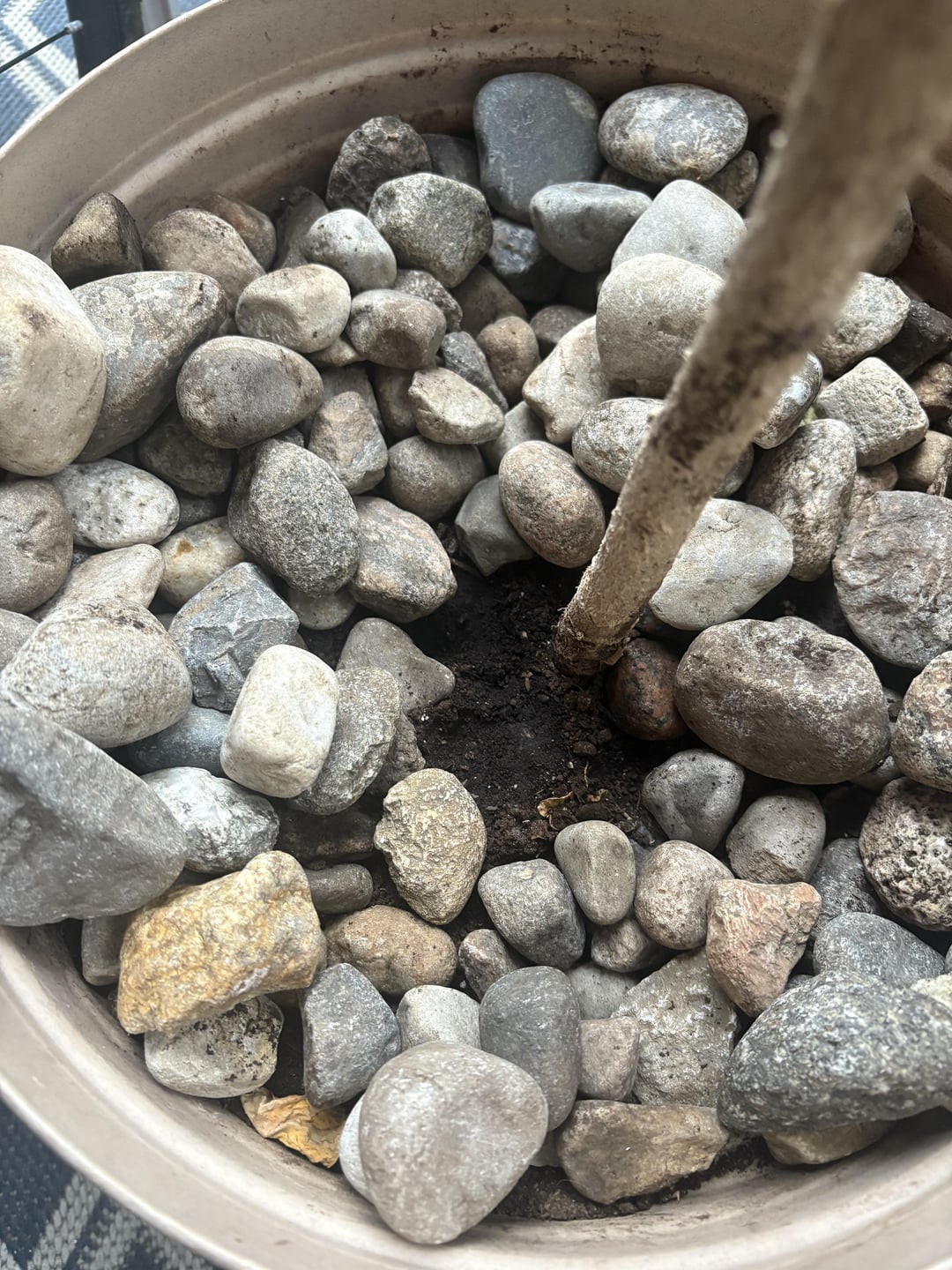 I’d remove the rocks, fluff up the soil and add more with fertilizer. Hibiscus needs a lot of water, they are from tropical environments. The key thing is that it needs more drainage. The dirt could be too compacted.