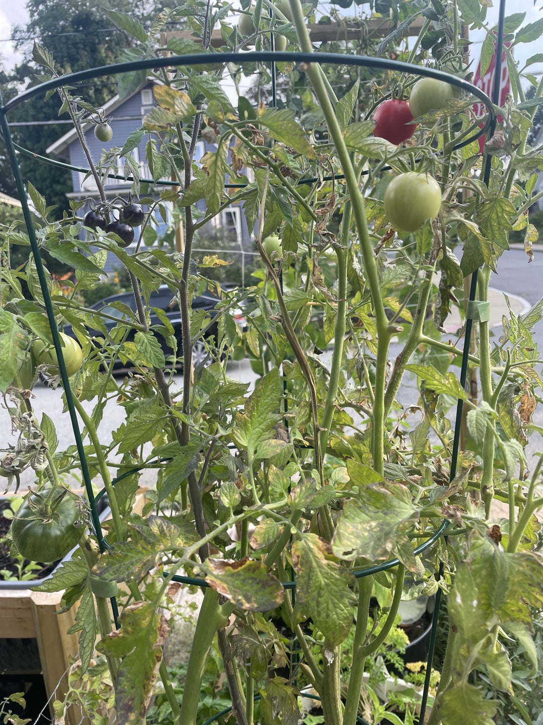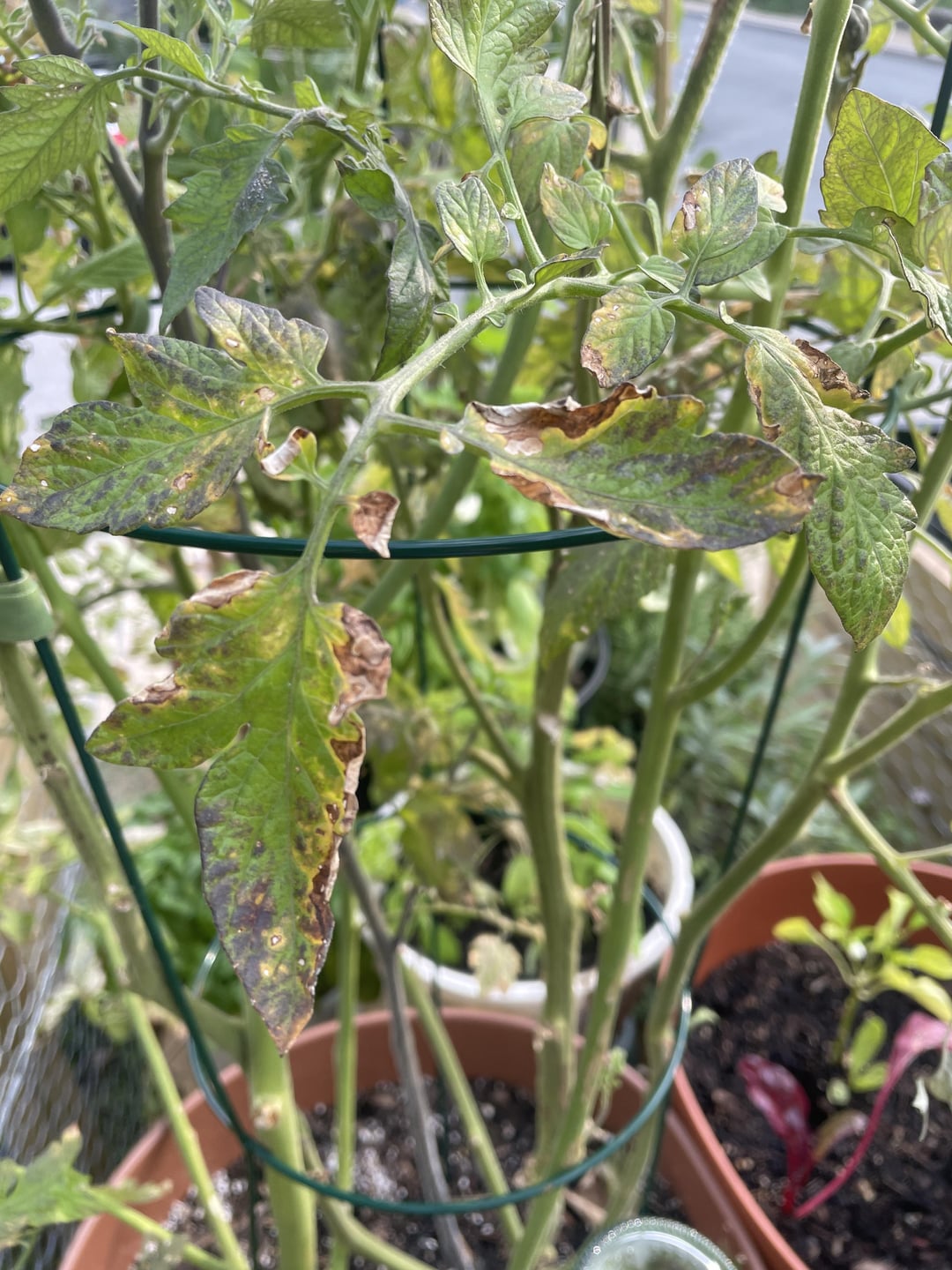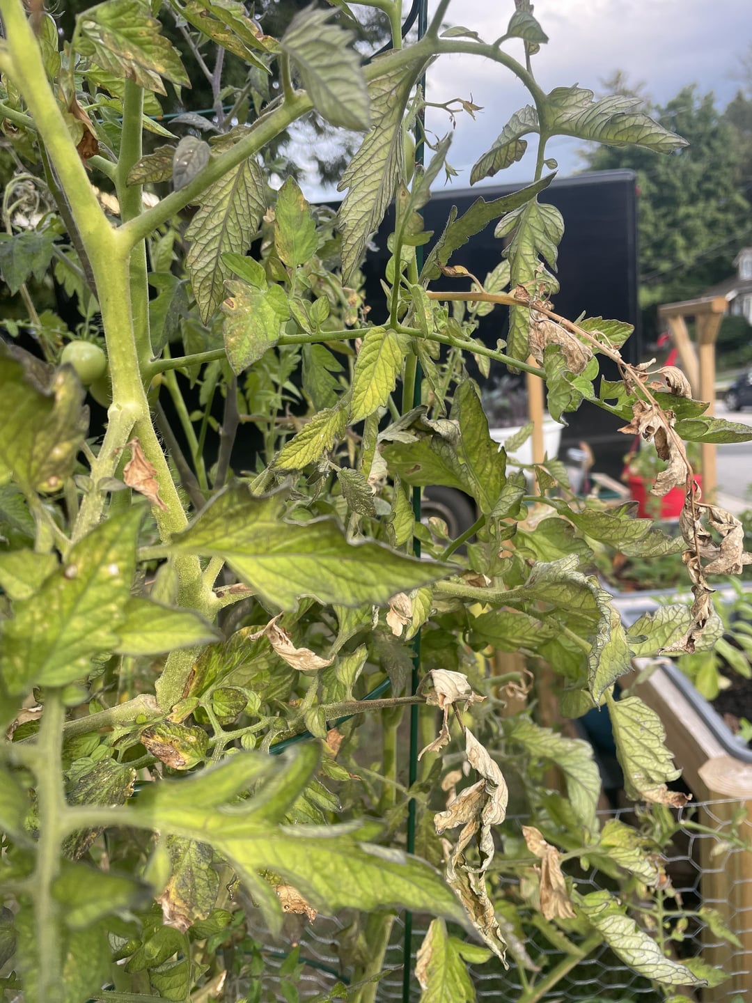 Zone 6b, I have a beefsteak and a campari planted in this big ol’ pot (maybe that’s the problem?). The leaves have started turning yellow/brown and crumbling, and one of the stems is purple. I water it regularly, slightly less so now that I have a self-watering stake. I used tomato-tone a couple weeks ago, but then worried that I over-fertilized, since that was about the same time it started looking sickly. Any idea what could be the problem (and/or if it’s salvageable)?