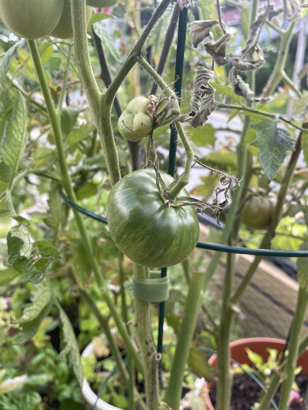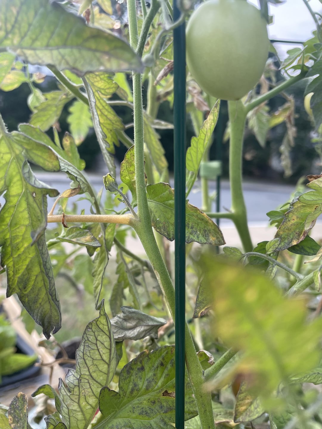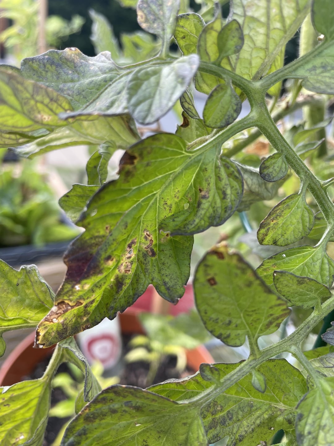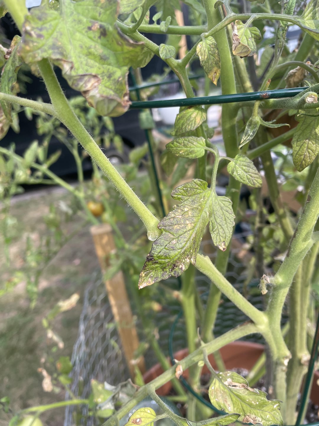 Zone 6b, I have a beefsteak and a campari planted in this big ol’ pot (maybe that’s the problem?). The leaves have started turning yellow/brown and crumbling, and one of the stems is purple. I water it regularly, slightly less so now that I have a self-watering stake. I used tomato-tone a couple weeks ago, but then worried that I over-fertilized, since that was about the same time it started looking sickly. Any idea what could be the problem (and/or if it’s salvageable)?