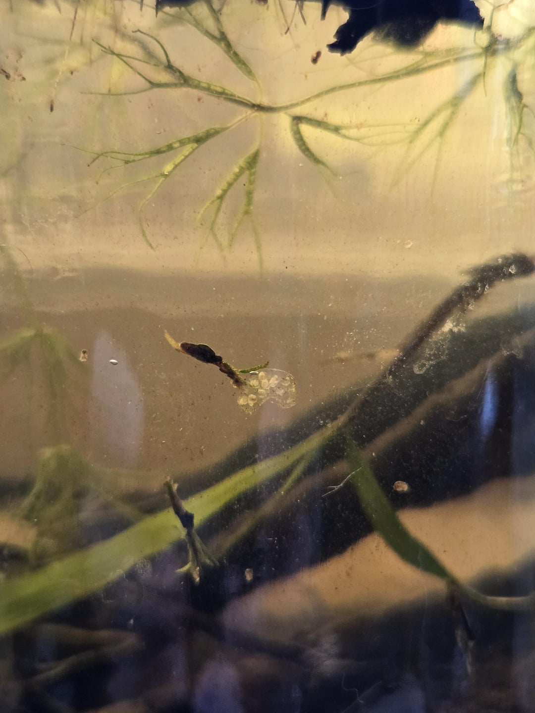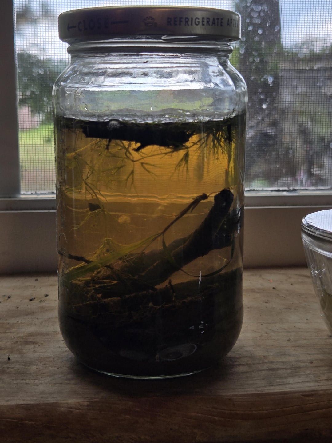 Attempted 4 jars with the grandkids, about 1 month old now, taken from a local swamp. Out of the 4 we DO have life in one! A couple of snails putt around doing snails things(cute!) but then there are these stick/grass looking things. They are very odd looking, we've been watching them and now they seem to be laying eggs! Any idea what they are? I am baffled.