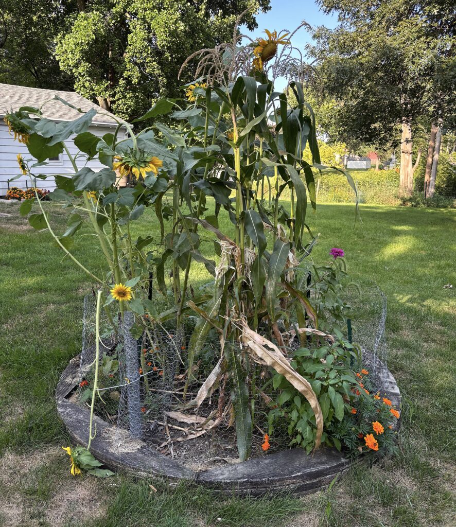 The sunflowers and popcorn rise above my height. Unfortunately, the popcorn will not be eaten. One, like all the other plants, a lawn treatment got aggressive and almost killed the crops before they started their life. After talking to Iowa State employees, they recommended not eating the produce from the affected crops. Two, the neighborhood gang of deer have made quick work of the popcorn. The yield was looking strong despite Southern Rust coming in late.