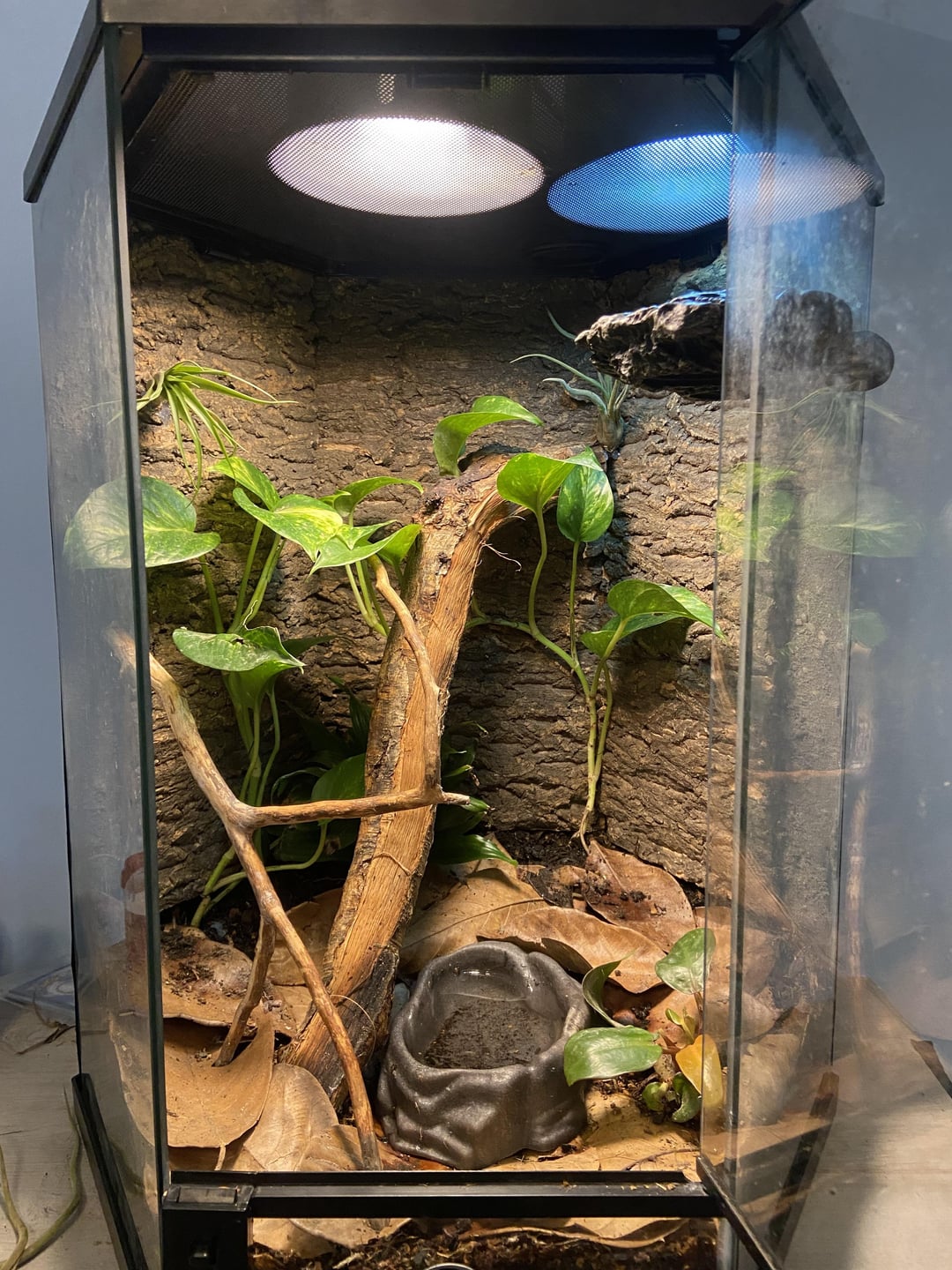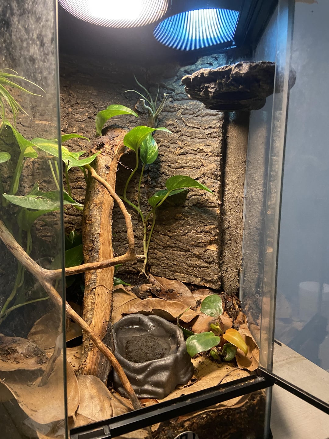 Add more branches and tropical plants.. Dart Frogs love Neoregelia Bromeliads, they can be mounted straight into the cork background.