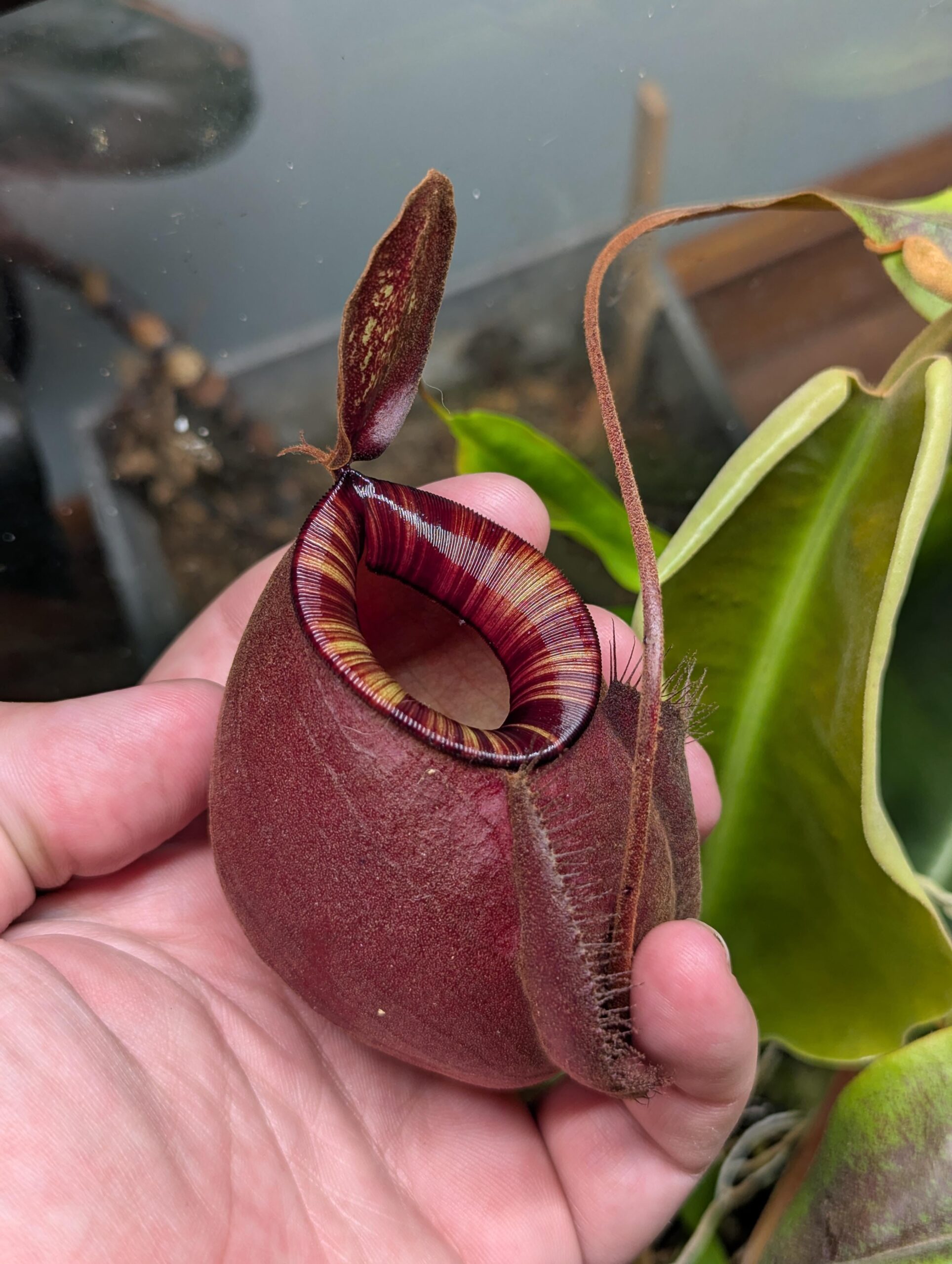 This is Nepenthes 'Black Miracle', and all of its neighbors are more of a medium to skinny shape, with N. barcelonae being the closest to what I'd call "tubby". This lack of diversity is probably contributing to unrealistic beauty standards and poor self-esteem for the little guy. Please share your tubbiest of pitchers so that we can all appreciate the rotund varieties that this genus has to offer!