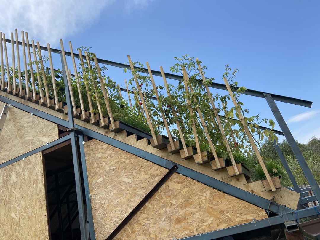 I made the roof structure of iron. I tried to avoid wood as much as possible. Trees have a much more important function than being used in construction: to produce clean air! I did use wood for the laces under the tiles, for the support of the plant gutters, and on the front side (OSB).