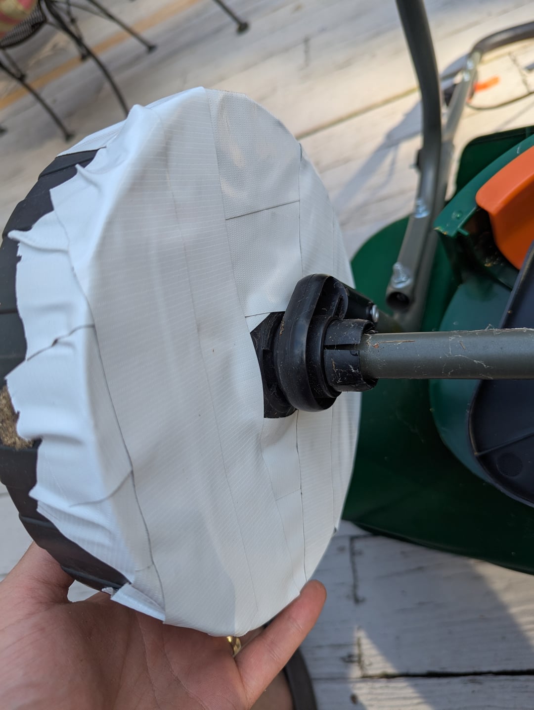The Scott's spreader gave me some bad strips of over-applied product this year. I'm hoping this tape job will prevent granules from collecting in the wheels for next time.