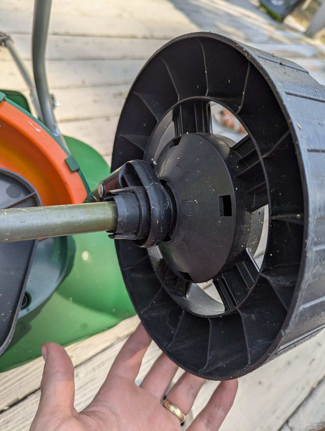 The broadcaster being below the top of the wheels is not the problem. It’s actually the orange edge guard bullshit. The granules drop down to the broadcaster from the hopper and instead of going wherever the hell they want they hit the orange edgeguard bullshit and drop straight down. That’s why everyone’s Scott’s edgeguard spreader is dog shit!