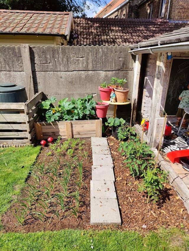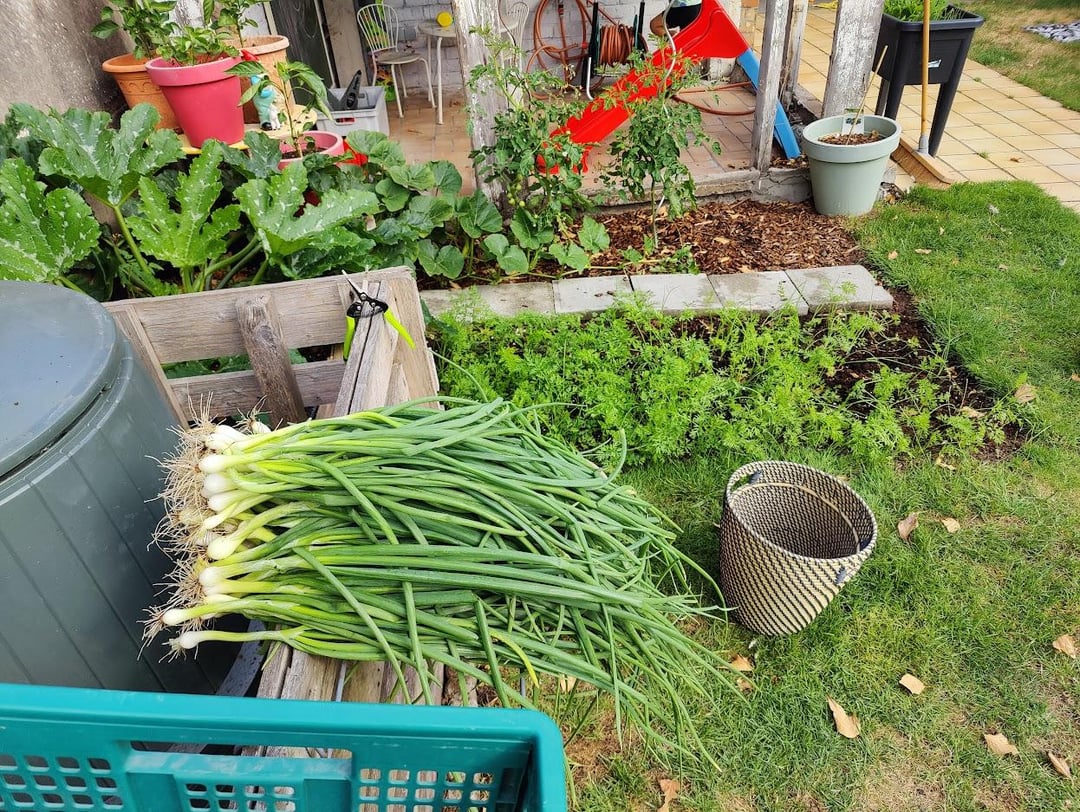 I had first sown carrots. After three weeks, nothing had come up, and I thought the seeds were bad or the soil was poor. So I planted spring onions (not from seeds, but from bulbs). A few weeks later, the carrots started to sprout after all. Luckily, I was able to harvest the spring onions quickly, so they didn’t obstruct the carrots. To my surprise, the carrots grew very well.