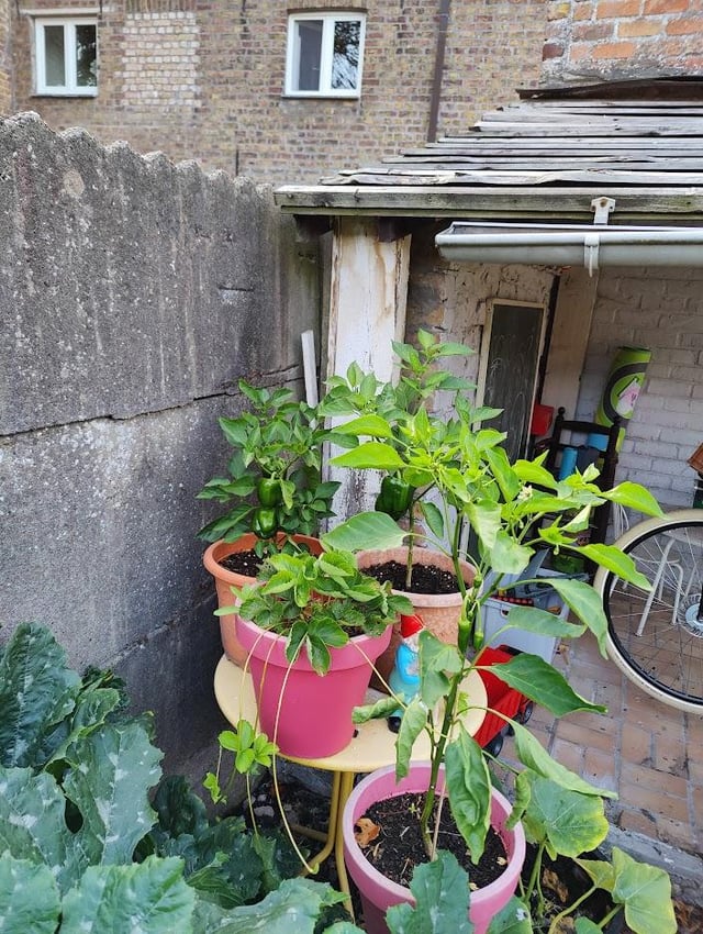 I also planted one zucchini plant, which produced a lot of fruit—at least 20 pieces. Additionally, I have cherry tomatoes, bell peppers, chili peppers, and butternut squash