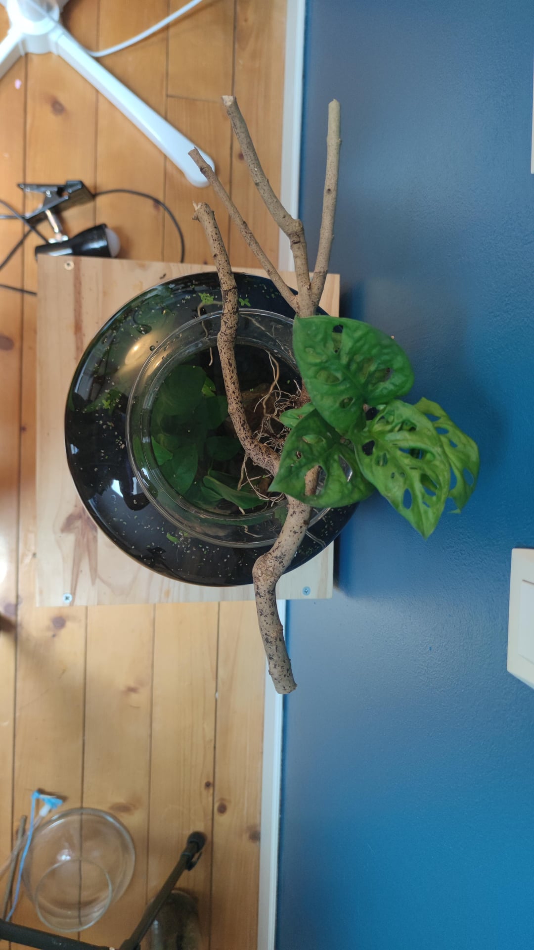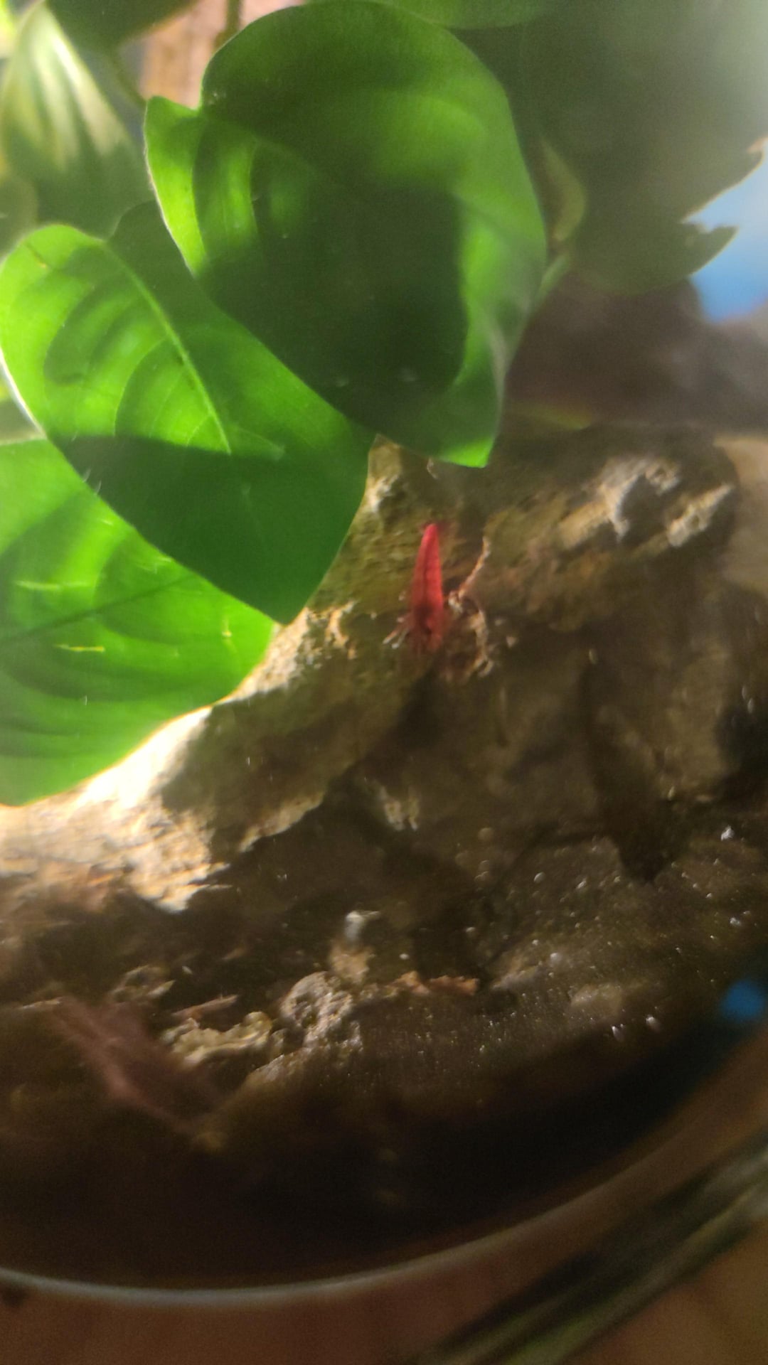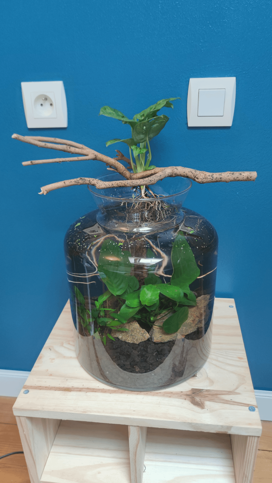 I just finished this build today by adding the piece of wood with the monstera on top, Inside of it are some red neocardinia shrimps as well as some snails, the plants are an anubias and a cryptocorine.