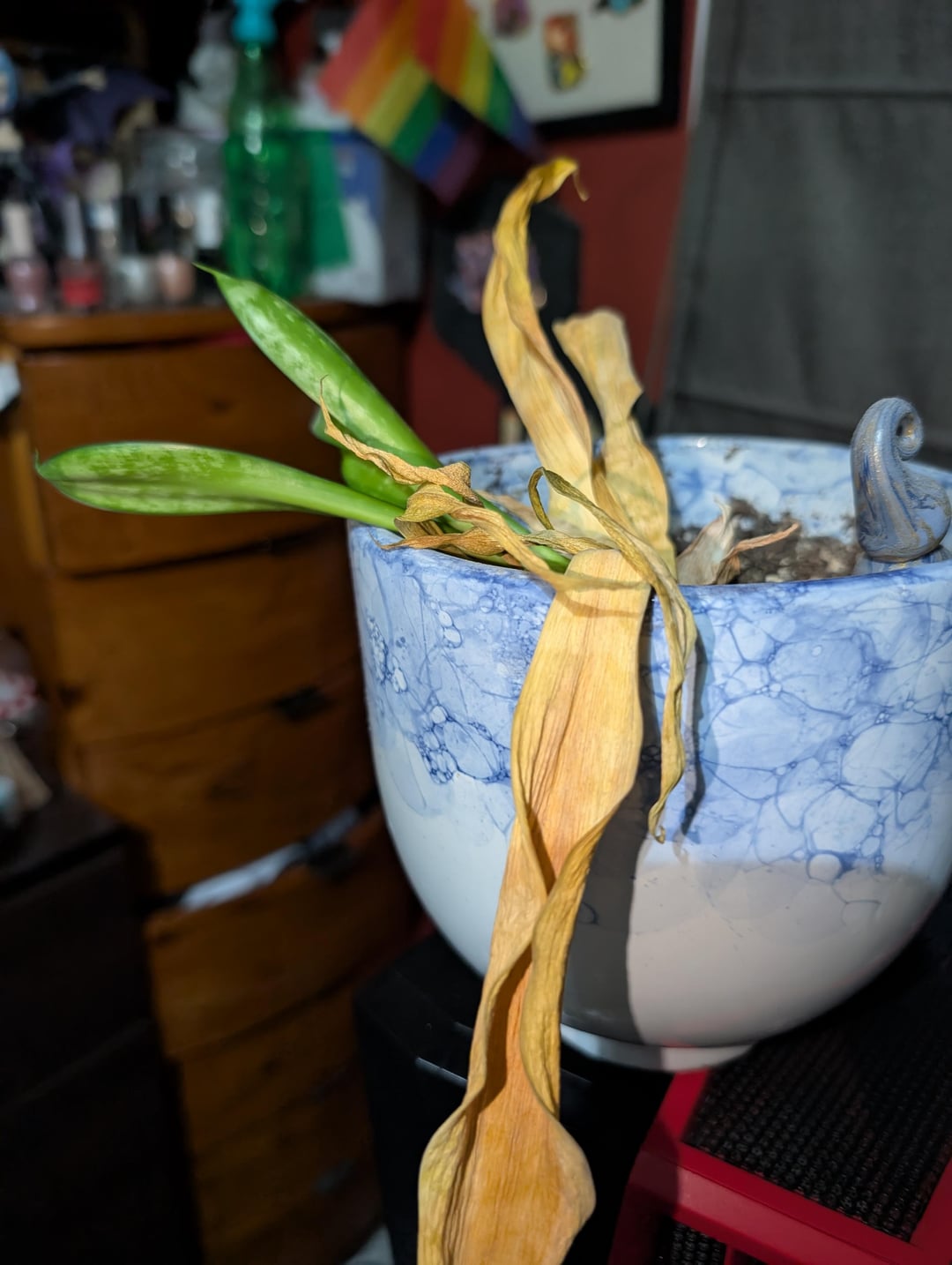 Also its being underwatered. Let the soil dry out between waterings, yes, but in a pot this small (is that even a pot? Looks like a bowl with no drainage holes) it definitely needs water more often than once every 6 weeks or however often you’ve been watering it.
