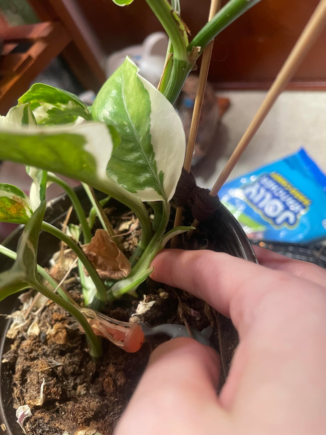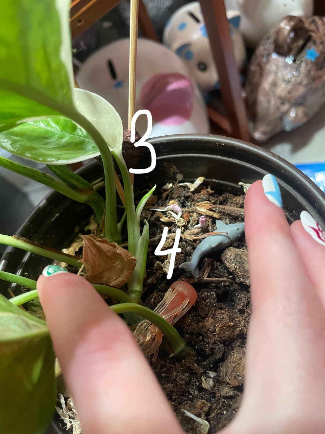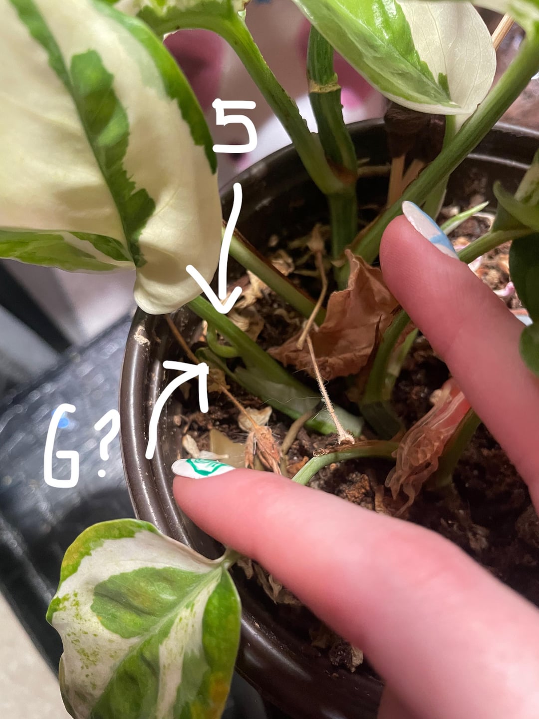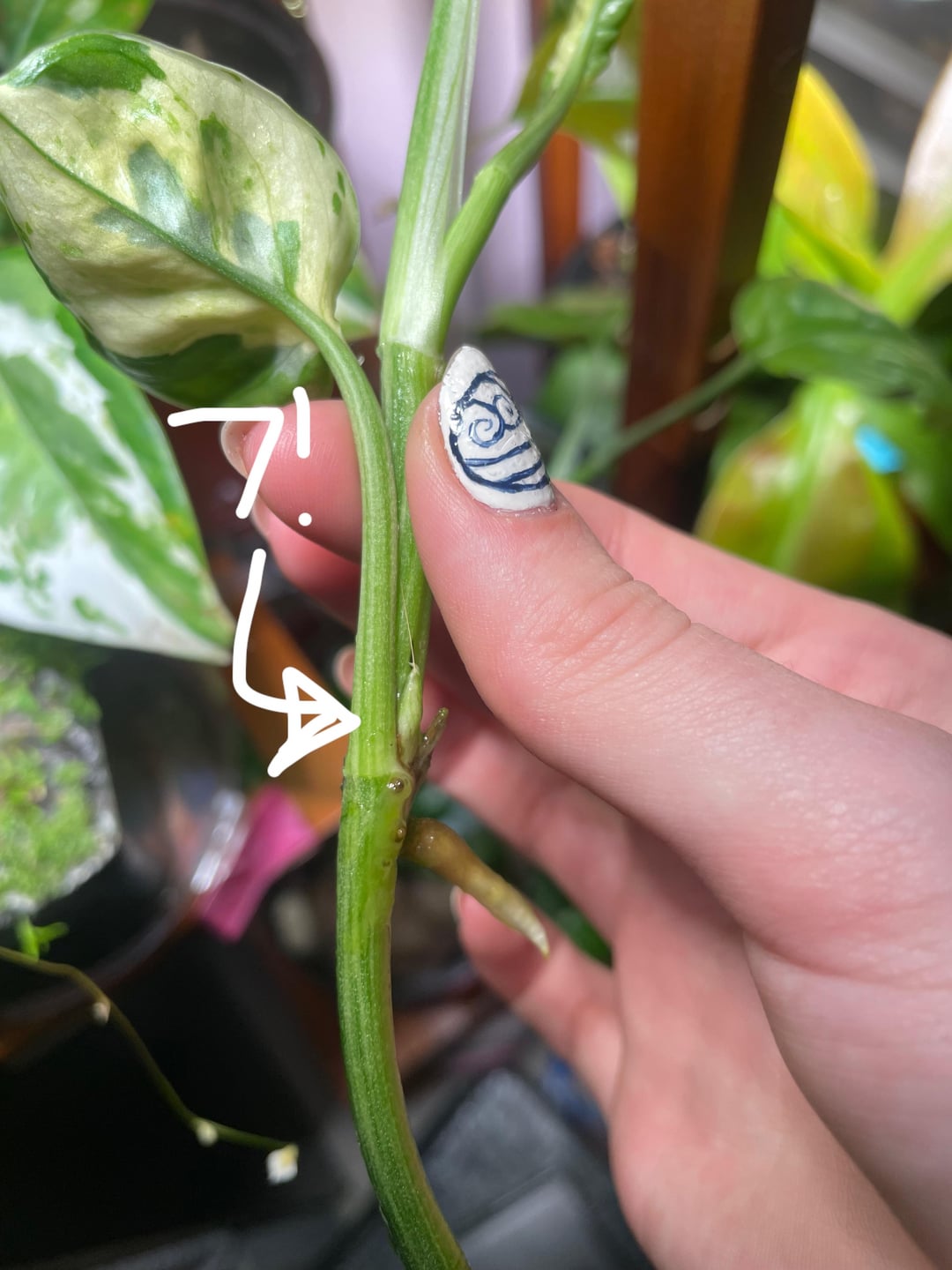 There’s two that shot out from the top of the vine, one which is developing a leaf. Additionally, there’s one healthy vine and one (kinda sad) vine coming from the bottom node on the left. There’s another two on the right, and even a teeny tiny one on the cutting I took! Lucky me ☺️