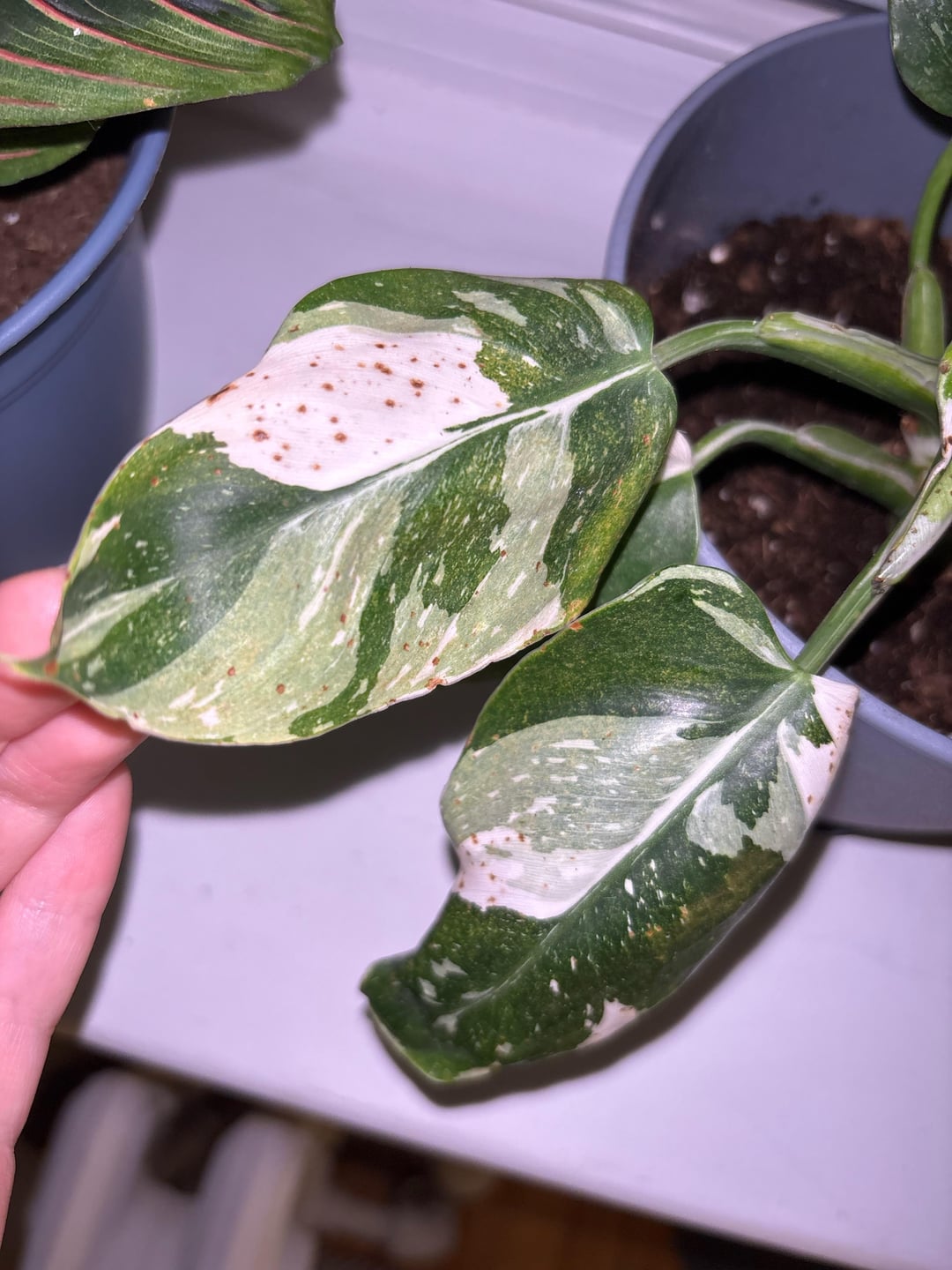 Anyway, random tidbit aside—what could the cause of the spots be?? I have him on a North-facing windowsill; is he getting too much light? There was some browning on the white variegation of some leaves, so I pruned them off. Maybe a watering issue? I wait until the soil is dry before watering, but maybe I’m not letting it dry out quite enough. Any advice or suggestions are appreciated!! Thanks🌱💚