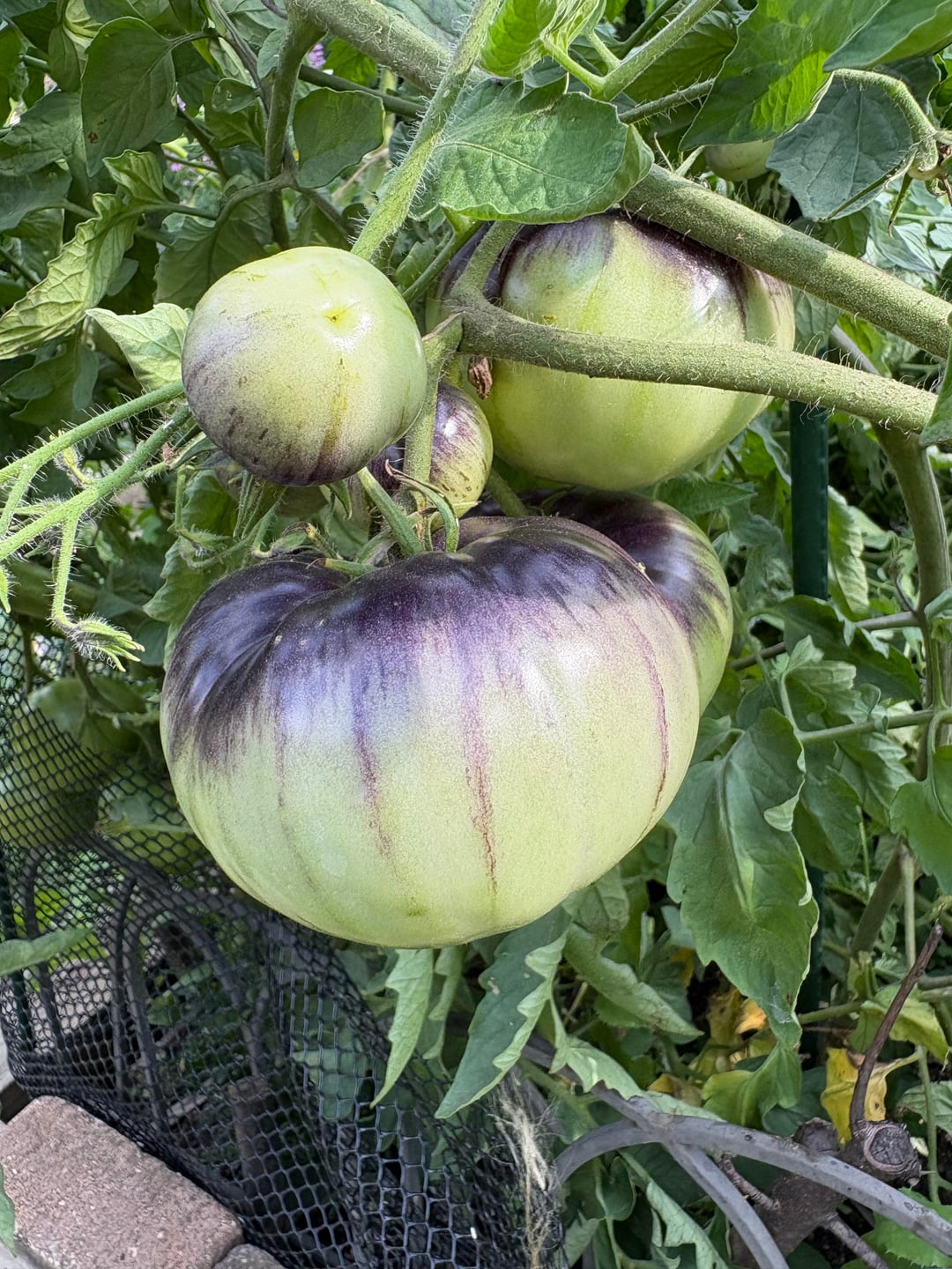 Lovely! We are finally getting some ripe orange moon glow ones in, and we have Cherokee purple heirlooms that look just like yours! Tasty very sweet not acidic at all
