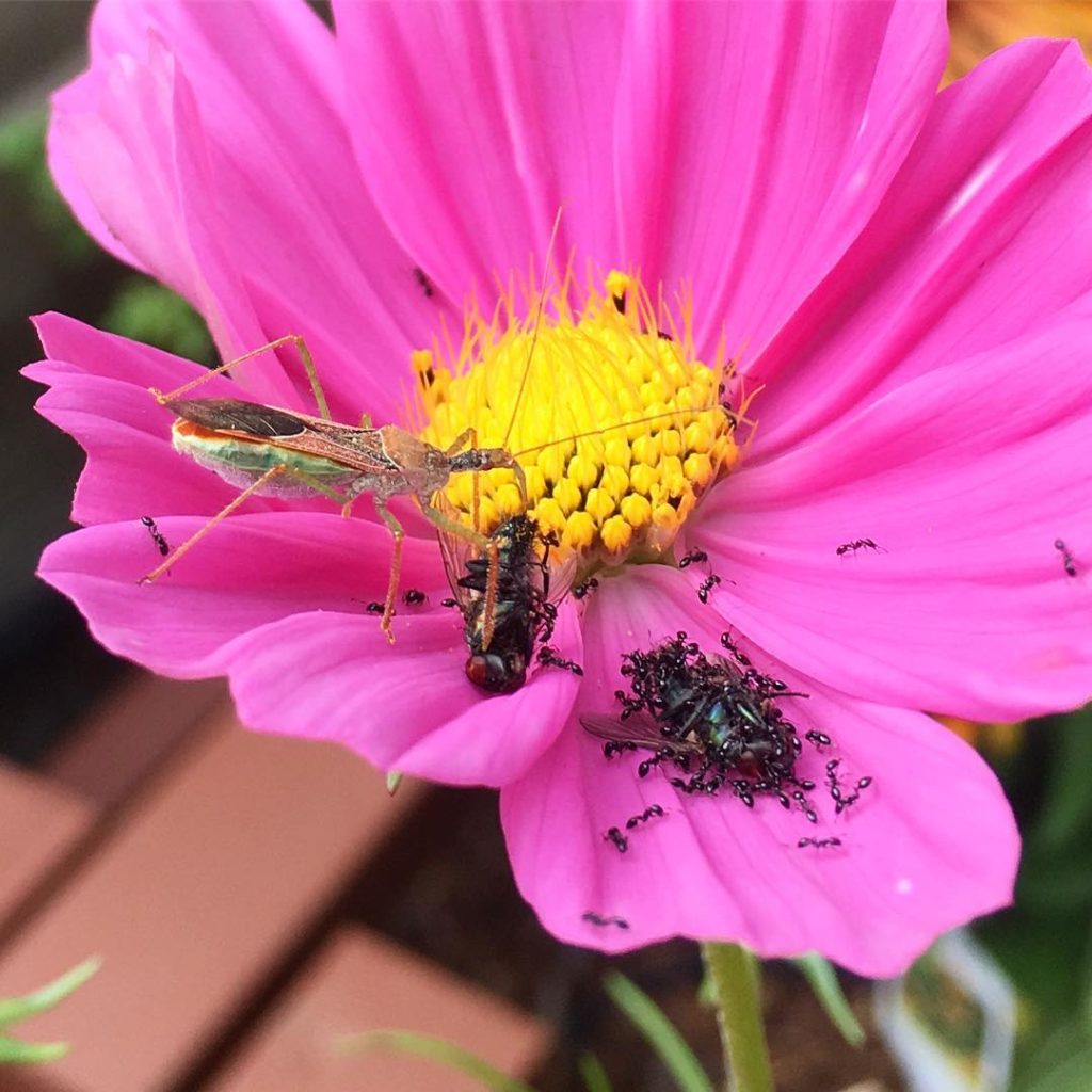 A crime scene just went down on one of our cosmos flowers 🕵🏼 An assassin bug brought two flies to this fresh bloom where it paralyzed them and sucked their fluids – and now the ants are destroying the evidence 🚧 Video up in our story. (Thanks @wildenauer_design_co for the bug ID) #naturerocks #csi #entomology #cosmos #thehorticultgarden #assasinbug