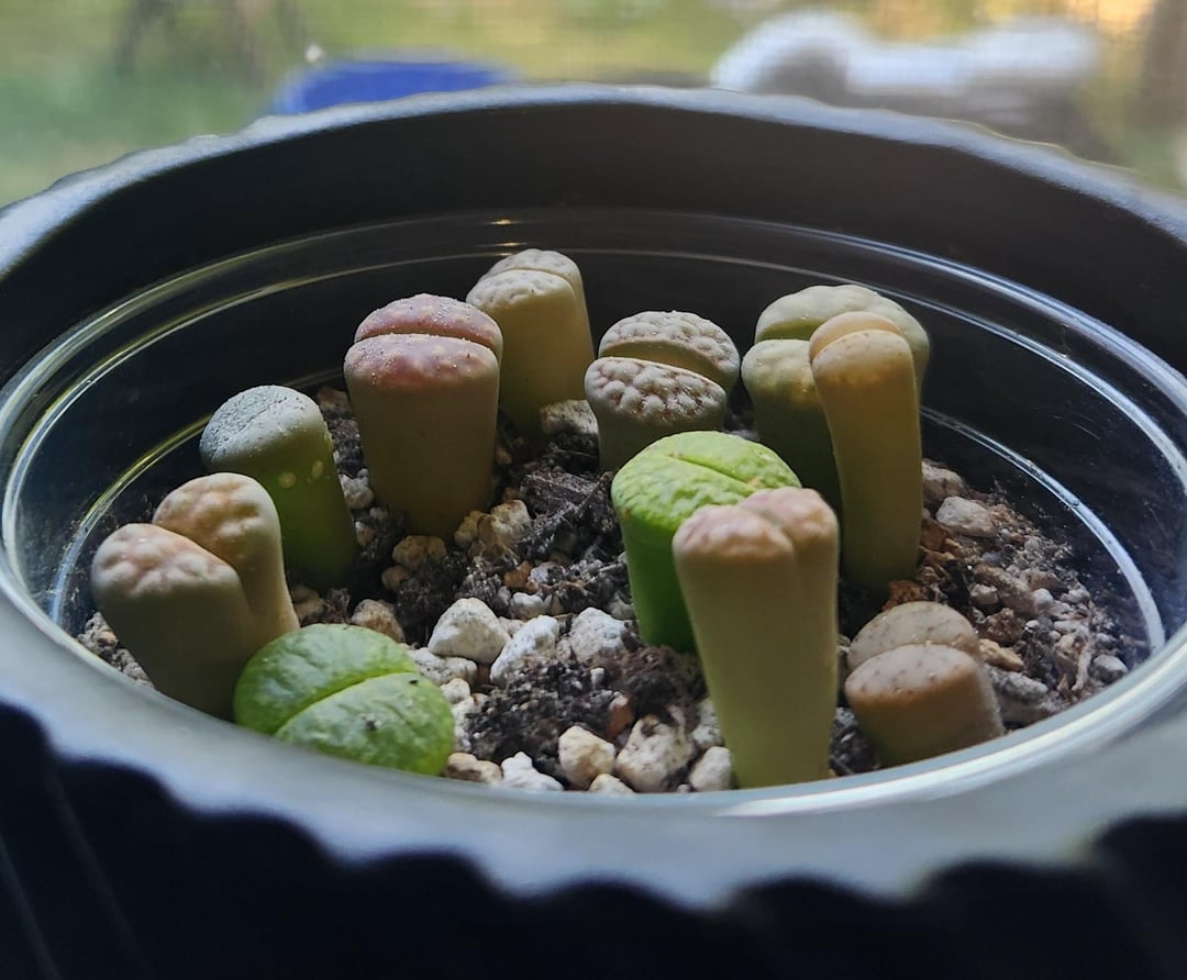 I got these little guys back in late April from Amazon of all places. I ordered some seeds (which sprouted but I under watered them so lost them already sadly) and lithops soil mix and received a total of 14 baby lithops as well. They all looked super healthy. I followed the instructions and watered them when I potted them (they came bare root). I placed them on a southeast facing window sill in the kitchen where they could get at least six hours of full sun a day.