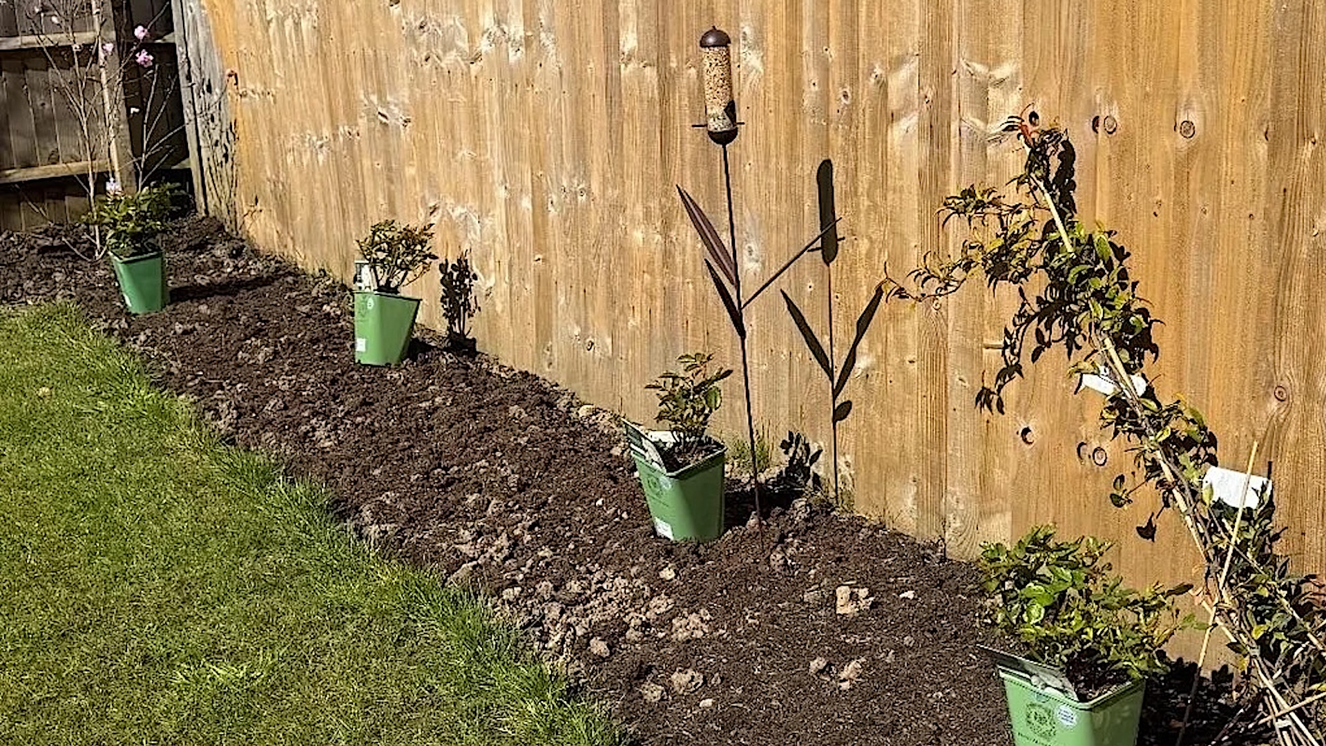Their “before” photo shows bare ground, with only a few potted seedlings to hint at what was to come in the future. The “after” photo, however, shows a flourishing mixture of white and purple flowers arranged along their fence.