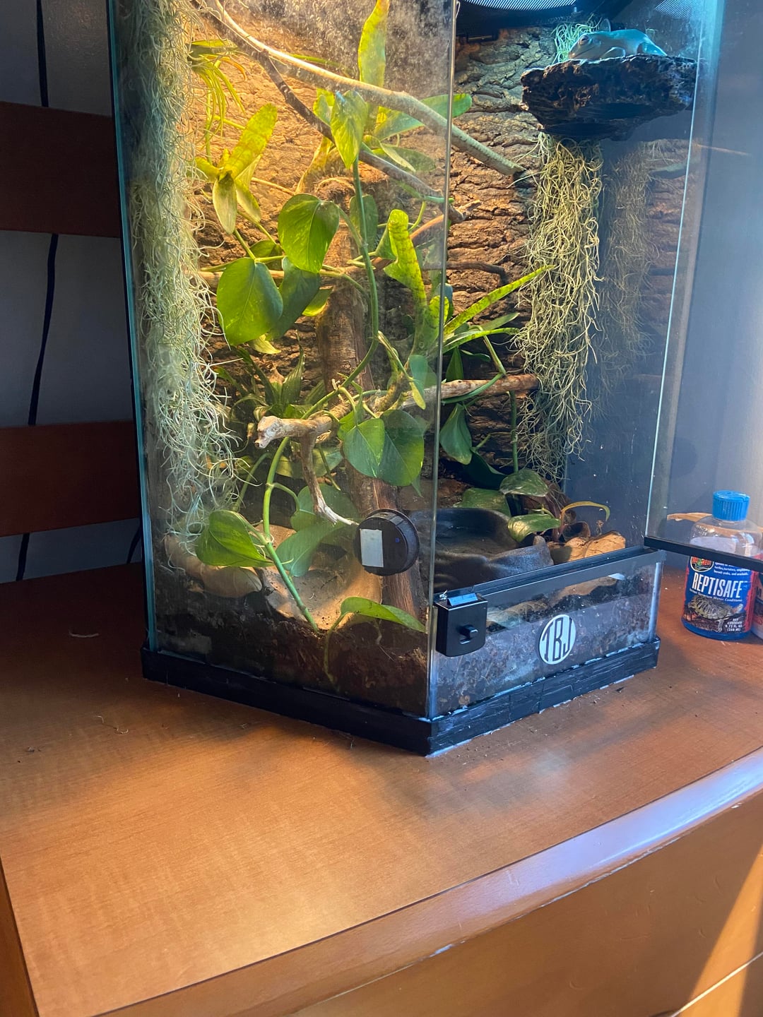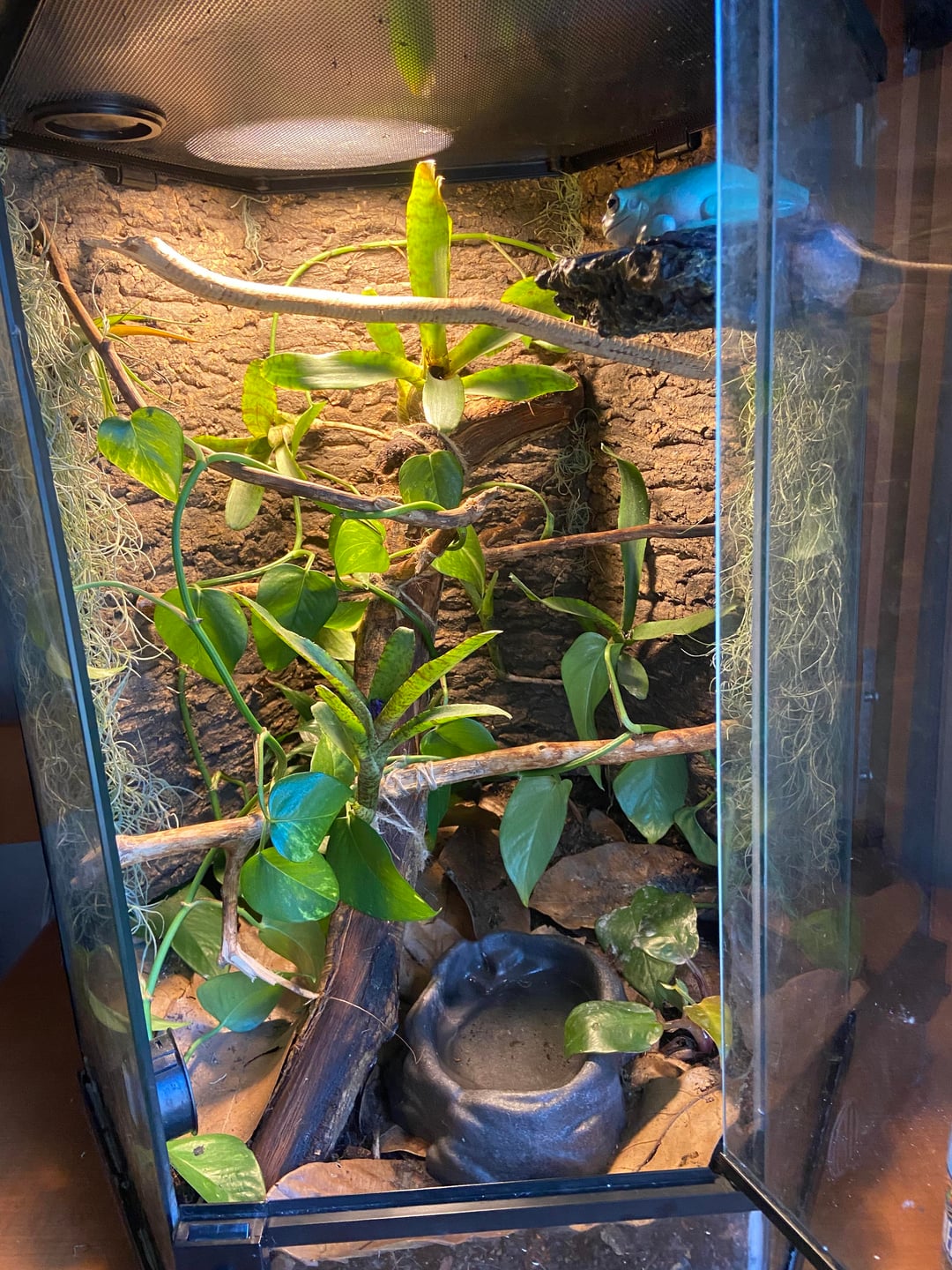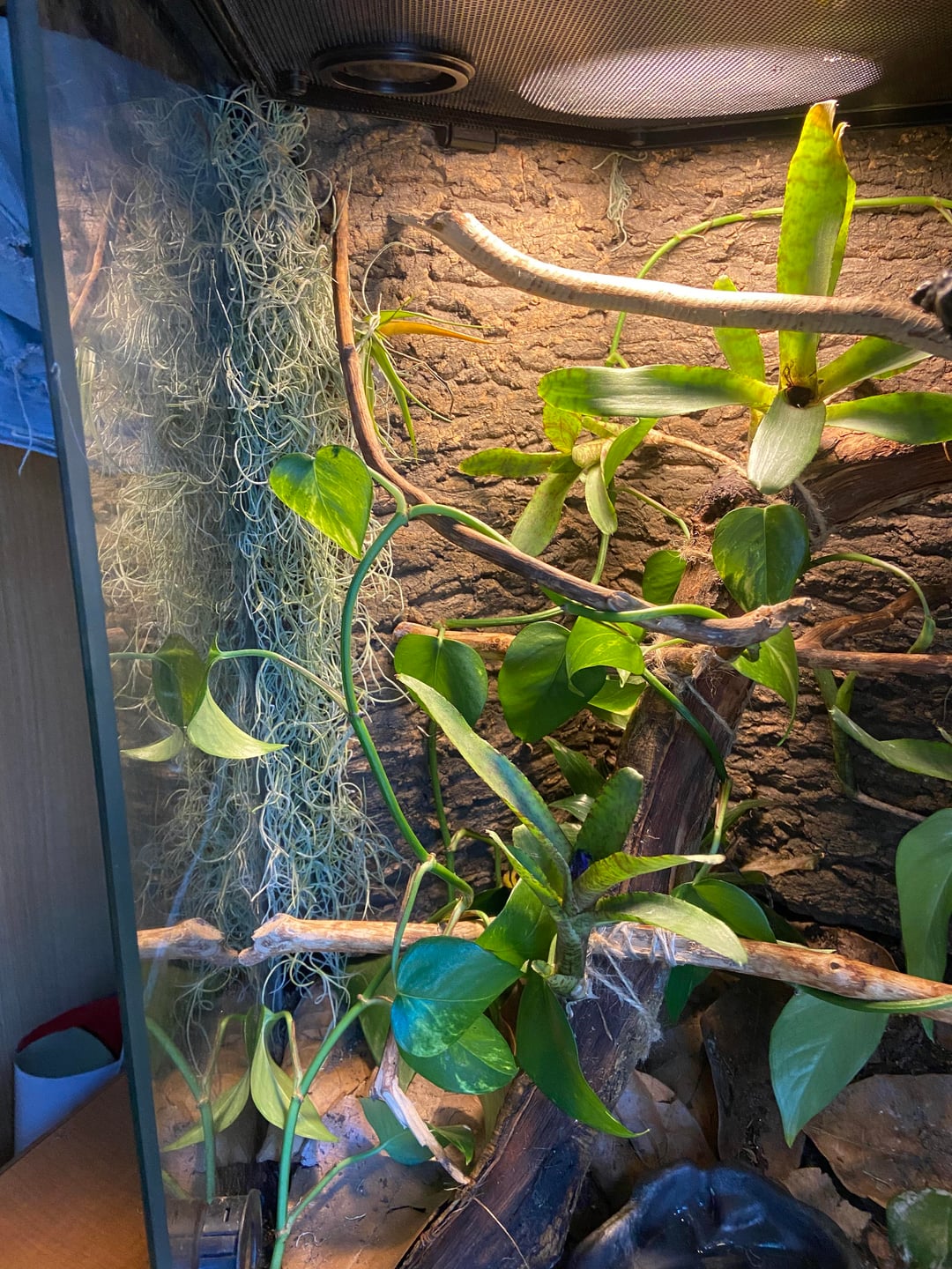 You could do with some kind of large plant in there or two something with larger leaves and strong enough to hold its weight, in your head it probably looks bad but when it’s in place and grown it it will look right trust me