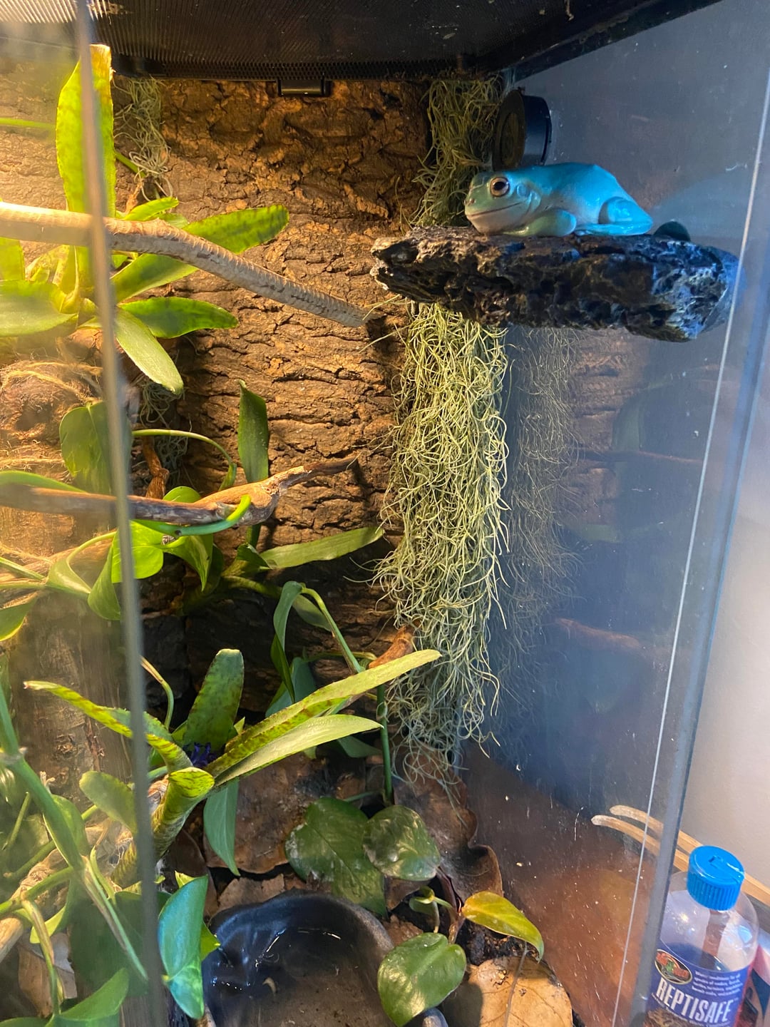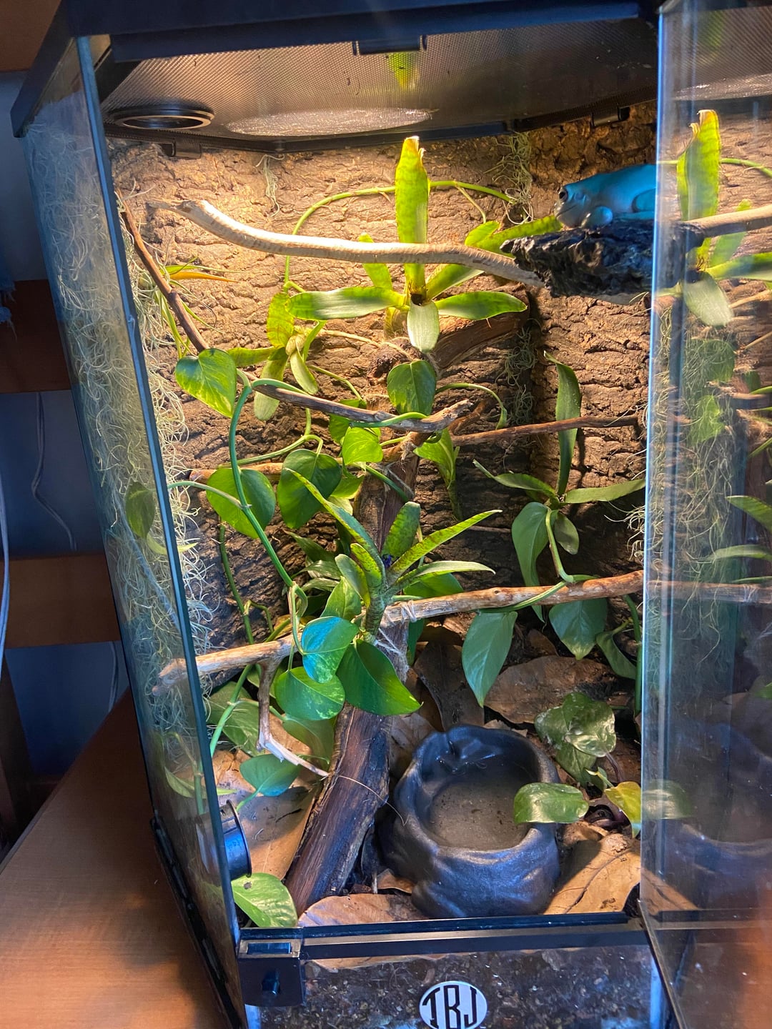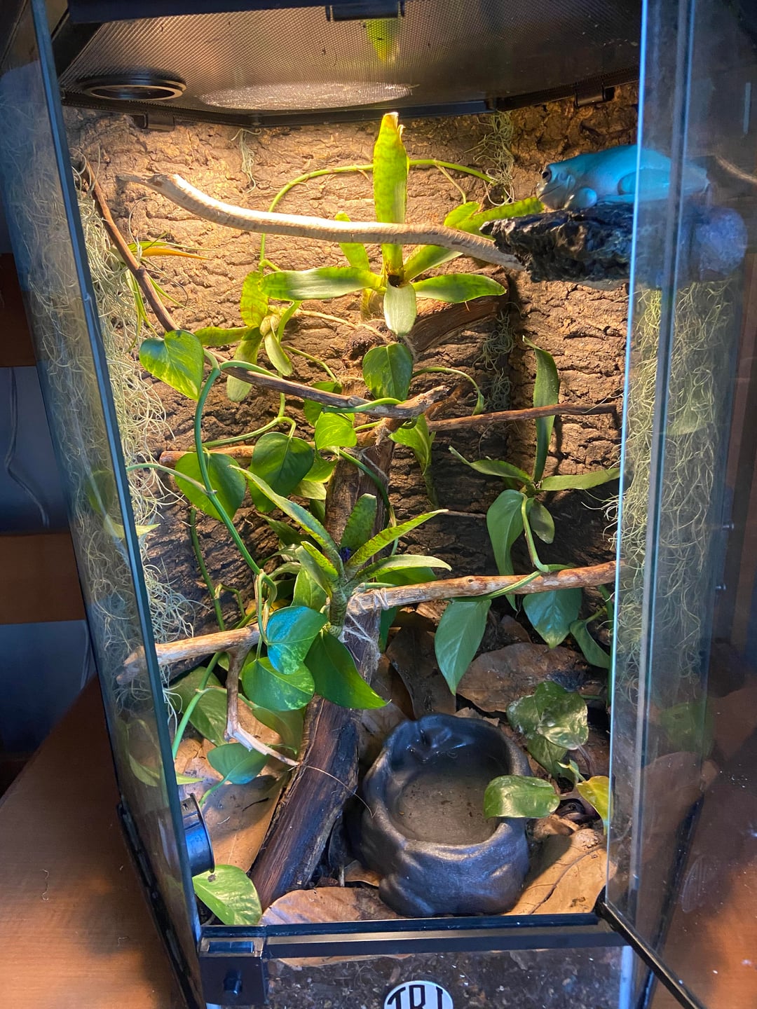 You could do with some kind of large plant in there or two something with larger leaves and strong enough to hold its weight, in your head it probably looks bad but when it’s in place and grown it it will look right trust me