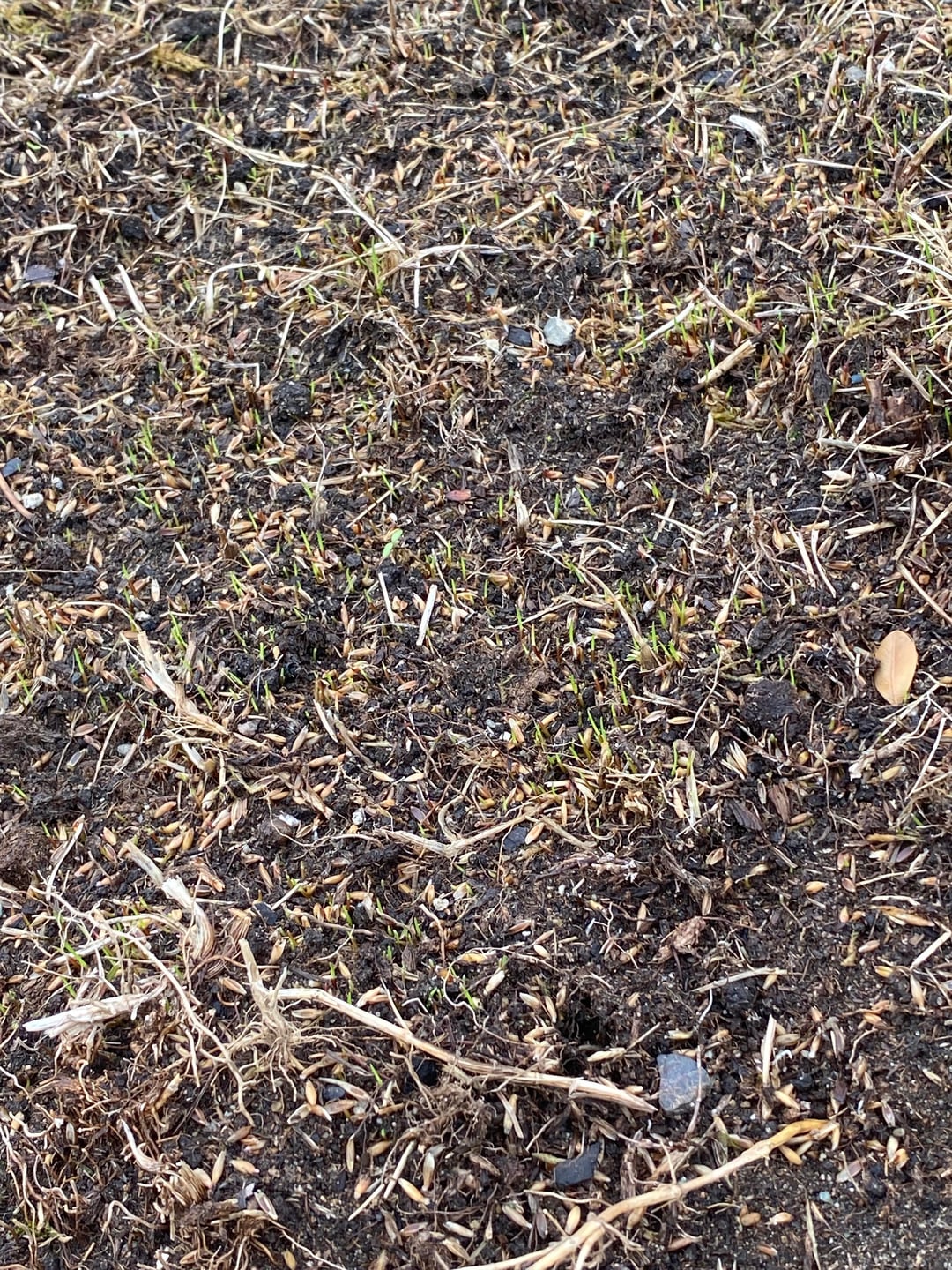 Seed (Emerald III TTTF blend from Buffalo Brand Seeds) and 20-0-0 fertilizer went down 7 days ago, yesterday I spotted 1 or 2 new seedlings, but overnight a lot more pushed through! Excited to transform this lawn. Before pic shows lawn post lawn prep, seeding and watering, other is new grass popping through this morning. Western WA, United States.