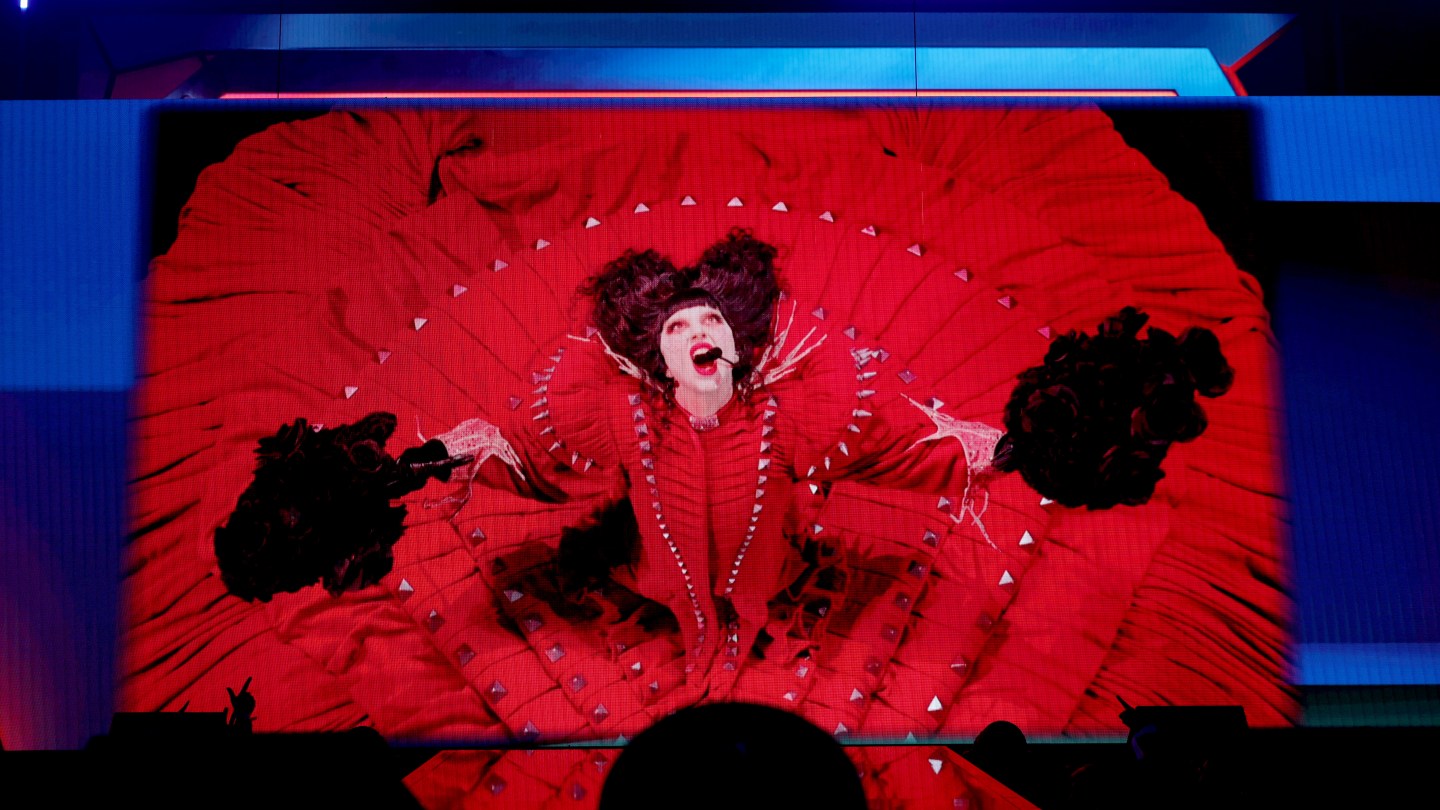 Introduced by Rosé, who urged Gaga’s little monsters to put their “paws up,” Gaga, from the Manhattan arena stage, where she towered over a cage full of dancers atop a massive red ballgown, declared “the category is dance or die.” After “Abracadabra,” Gaga dropped down from the top of the dress into the cage and re-emerged from within the cage sporting her “Dead Dance” grey curls. After the cage opened like a gate, Gaga and her dancers moved down a long runway to the middle of the arena and then she ran back with her dancers as she sang, “Do the dead dance.”