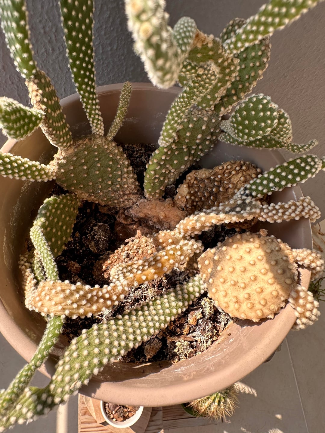 Thumpers buddy here, Thomas, seems to be in alright shape but the bottom of him is kinda brown. This one looks like it is in the original pot so part of me thinks giving him a terracotta pot might help but also have no clue what needs to change here. They are in the same space so you’ll see Thomas has full light and is on the same balcony.