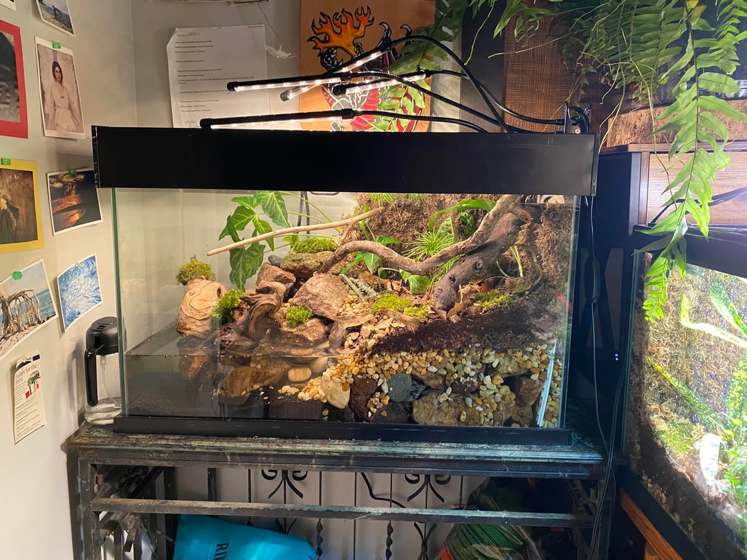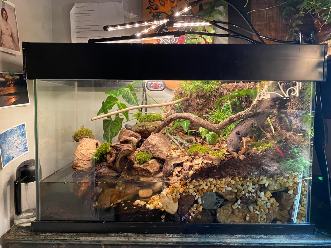 Water is filtered, heater is in the mail, the lid is a screen top :> isopods and springtails will be the first inhabitants, after that I’m not sure! I’d love some suggestions on what would be happy in the water