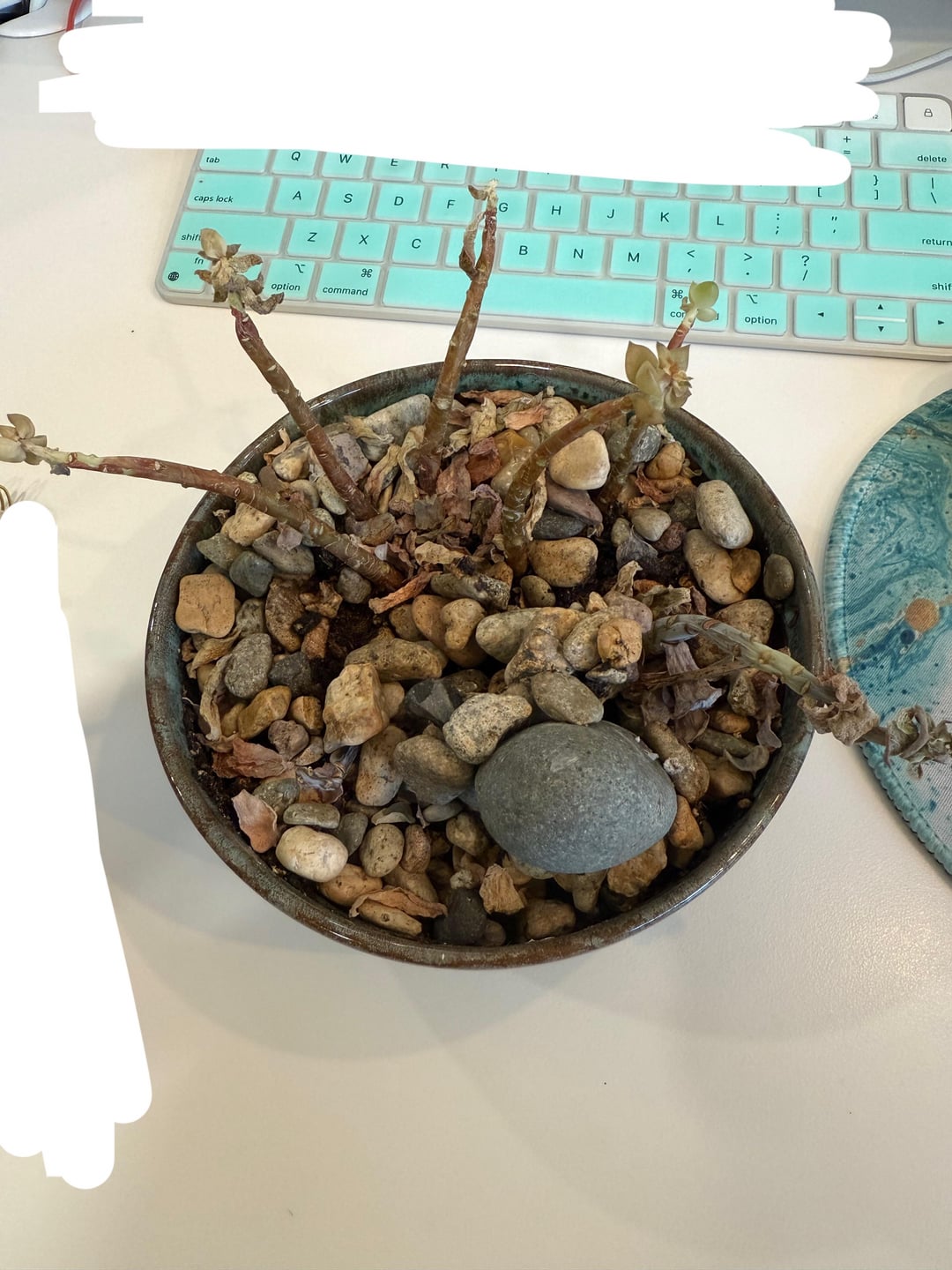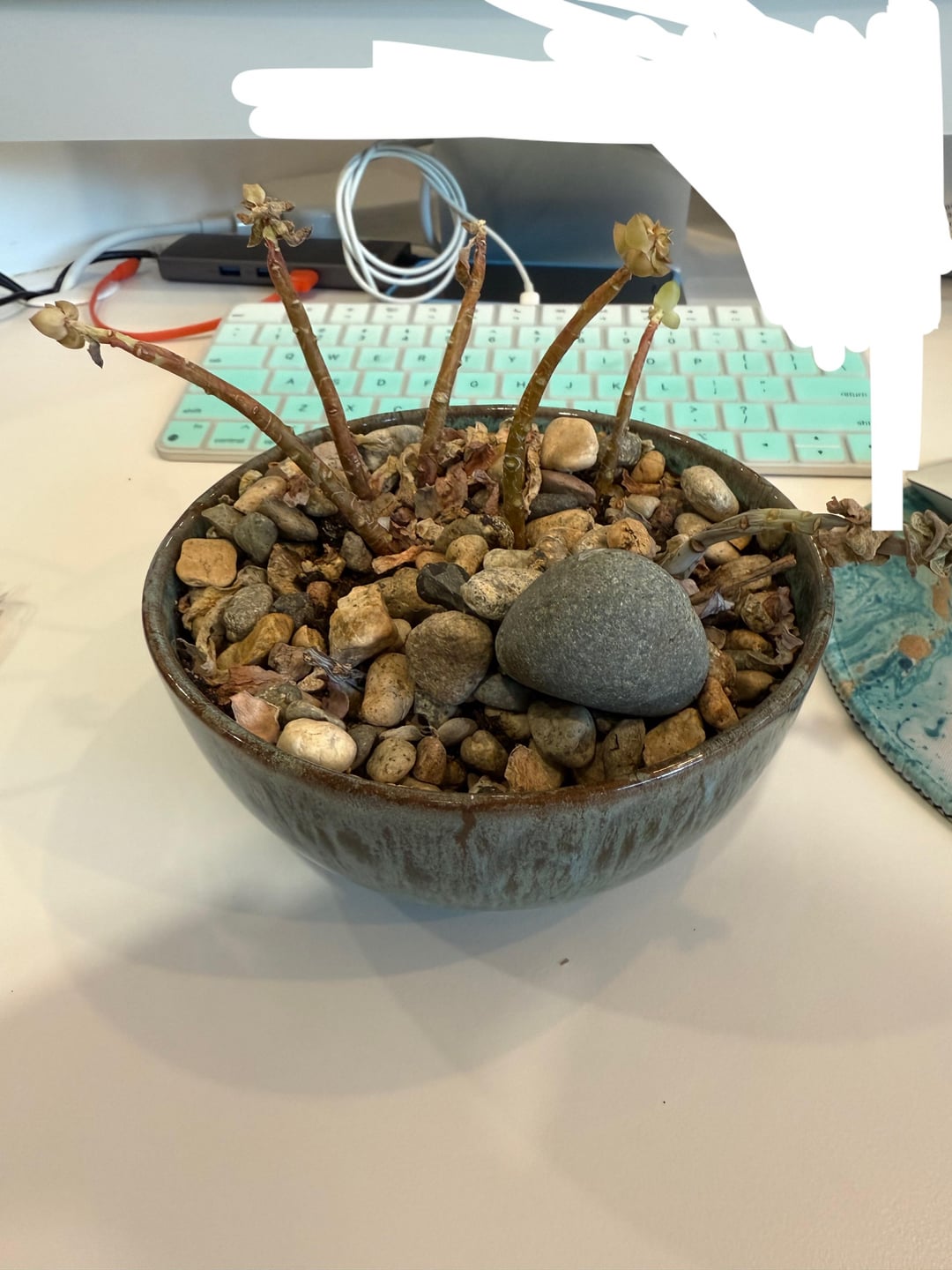 Nah, it’s totally saveable. Take the rocks off the top to start with then cut all the stems down to about the same height as the top of your ‘A’ key. Indirect sunlight all day for a week and no water then give it a good proper drink and leave alone until December.