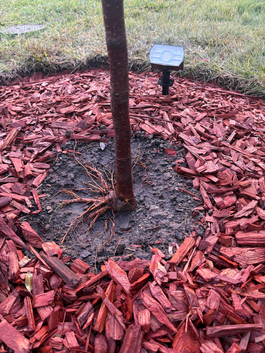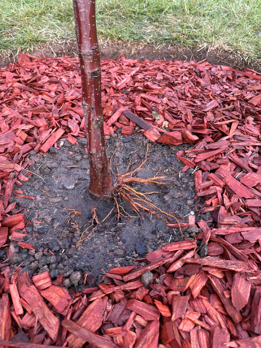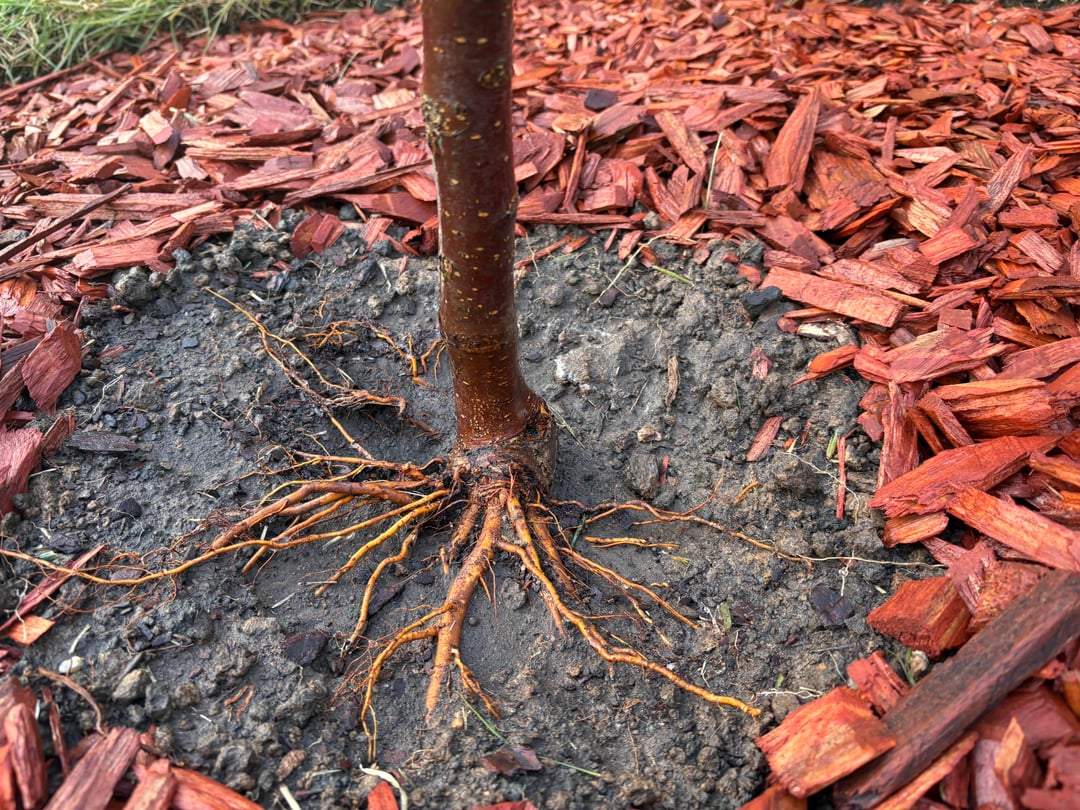 I recently planted this Royal Raindrop crabapple in place of my diseased redbud. I did my best not to bury the tree too deep and keep the flare exposed. I see a lot of roots coming out of one side of the flare and just wanted to make sure if they were ok to leave, or if they need to be covered with soil, or cut back?
