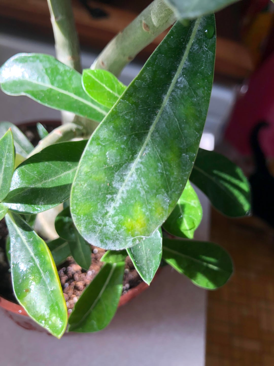 Her larger leaves are coated in what appears to be a thin, white coat of a dusty substance, and they’re not soft like the younger leaves. If I rub on them, a little bit will come off, almost like a sort of stubborn dust. They’re also yellowing.