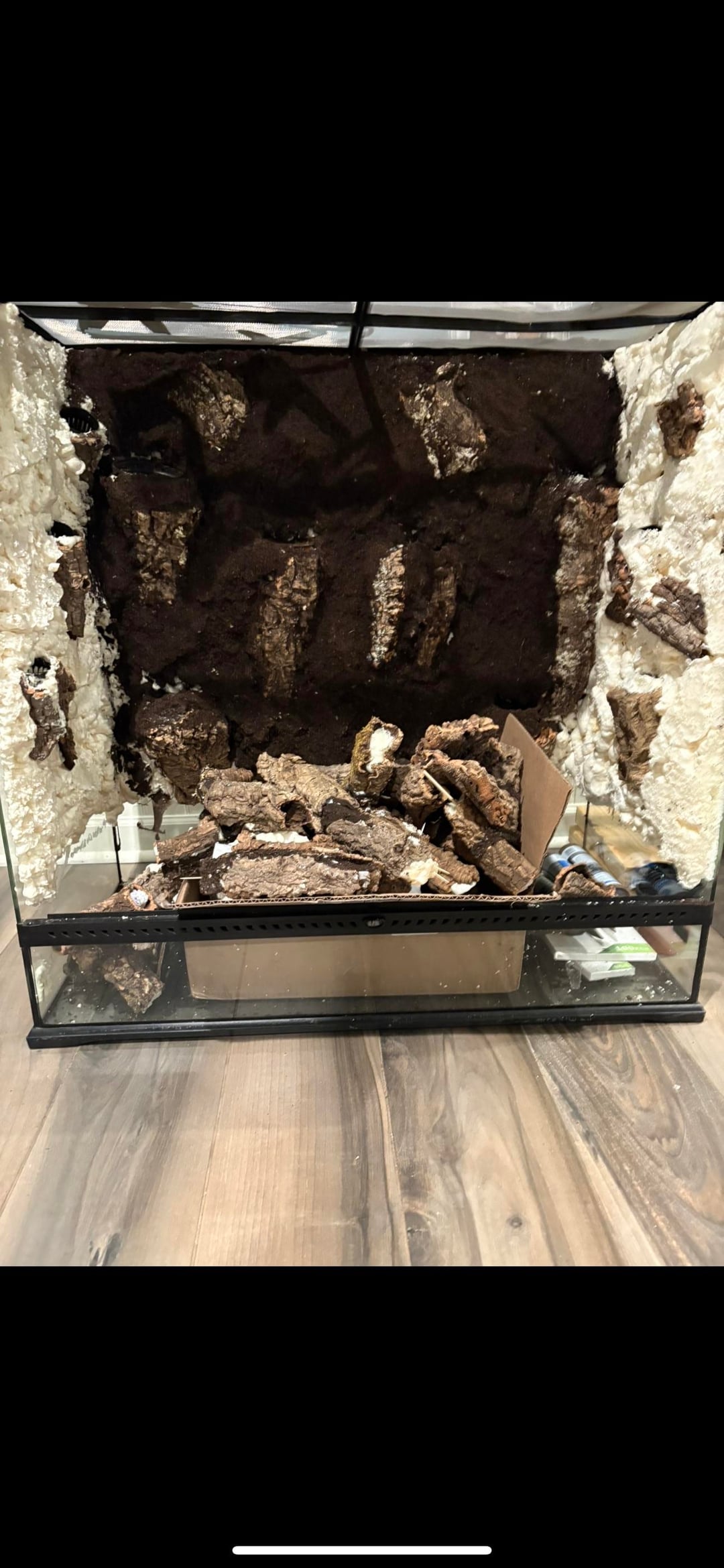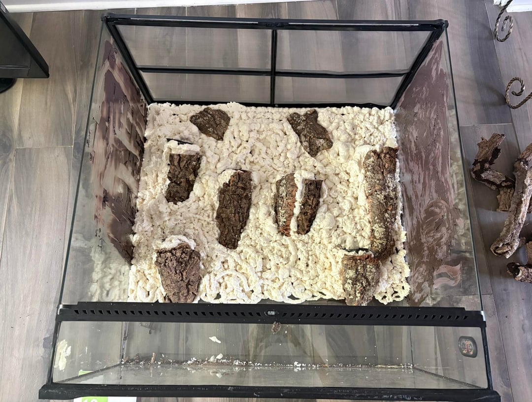 To make the logs I took small 2 inch rounds from NEHERP and pieced them together with foam and skewers to make unique shapes. I would use large bamboo rods to support the logs into the already foamed and siliconed background and then foamed the logs into place. To cover the spots where I placed cork rounds together I used sheet moss.