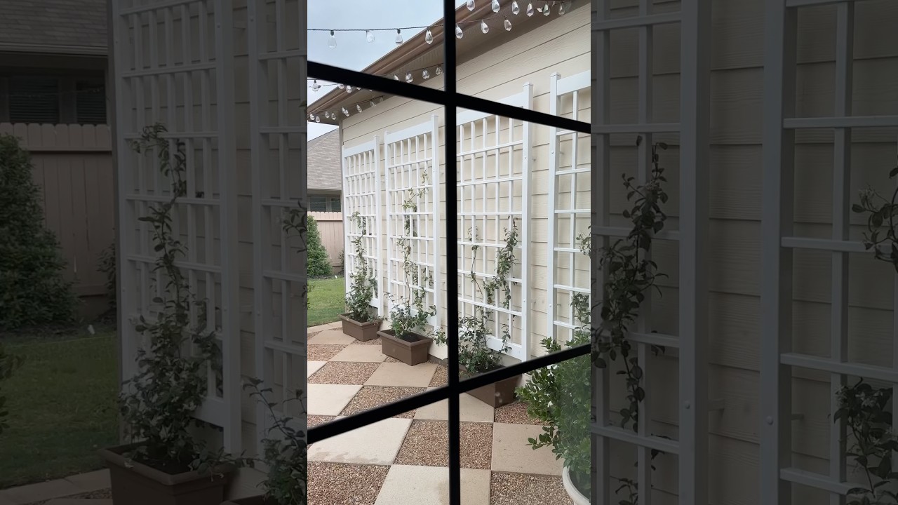 Welcome back to our backyard transformation where we just took our very, very ugly backyard and turned it into a European inspired oasis that we now love. When looking at inspo, I noticed I am in love with the look of greenery growing on walls or trelluses. So, I wanted to make that happen in some way. We have this very large empty wall on the right of our patio, and I thought it would be perfect for some trelluses and star jasmine growing on them. So, I bought four of these trelluses. They were pretty easy to assemble. It just took a little muscle. I wanted to make sure they were wall-mounted and not just standing on the ground. So, that was key in my search for trelluses. It was a little tricky making sure they were all the same height, but I think we did okay. Then we just put the star jasmine in these long planters and intertwined them here on the trelluses. It’s my first time doing this, so please don’t judge or learn from my methods. And here is how they turned out. I love them so much and can’t wait for them to grow. Also, this is my new view from my living room, which I’m obsessed with. Our furniture is coming super soon, which will finally complete this